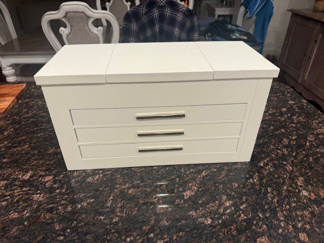 Constructed of MDF, linen and iron studs. MDF is an engineered wood that lends exceptional strength and ensures the product’s structural integrity over time. Compartments are lined with linen. Antique White finish. Top section has 12 compartments. Top drawer has 18 compartments. Middle drawer has three compartments. Bottom drawer has one large compartment. Monogramming is available at an additional charge. Monogramable with one letter only. Monogram will be placed in the lower right corner of the inside mirror. Felt pads under box. Imported. Wipe clean using a soft, dry cloth.