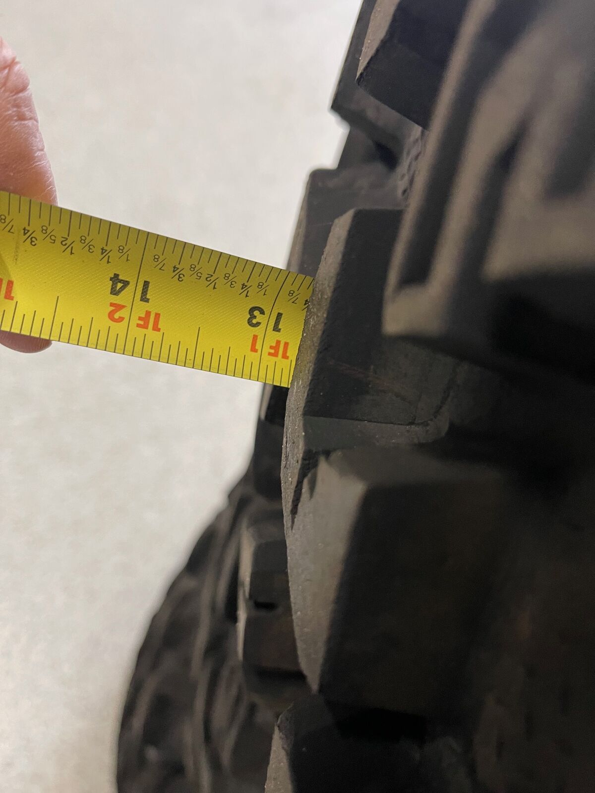 Motoclaw 32x10R16 UTV Tires. Had a flat tire and decided to go with 35" tires - one of these is the spare and is new. Good tread, see pics and dimensions: depth is 3/4", 7/16", 9/16" and 3/8"