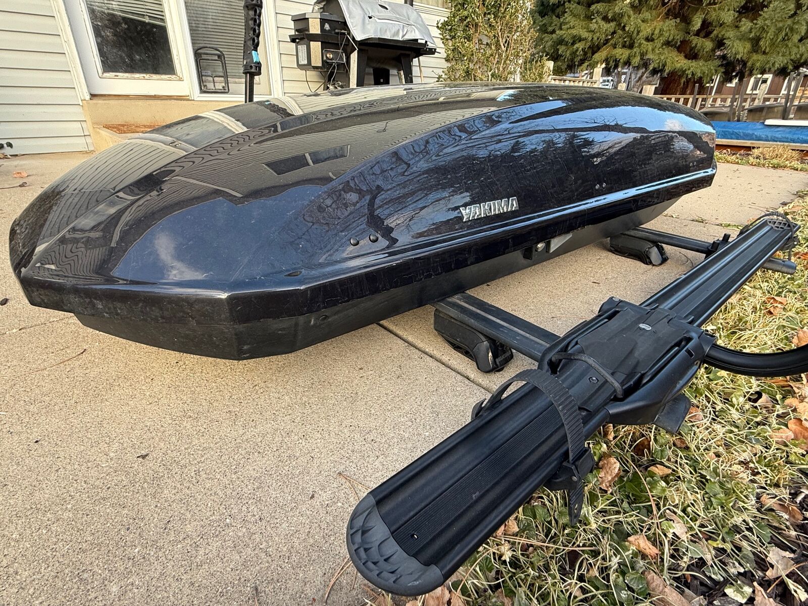 Yakima cargo carrier with twin RockyMounts bike racks. Works great, just needs a little cleaning. Comes with all mounting hardware along with side by side racks for transporting your mountain or road bicycles to your favorite riding destination. Spacious cargo space for sleeping bags, tents and outdoor gear. Purchased new from Rack-N-Road in SLC for $1800. $1100 obo.