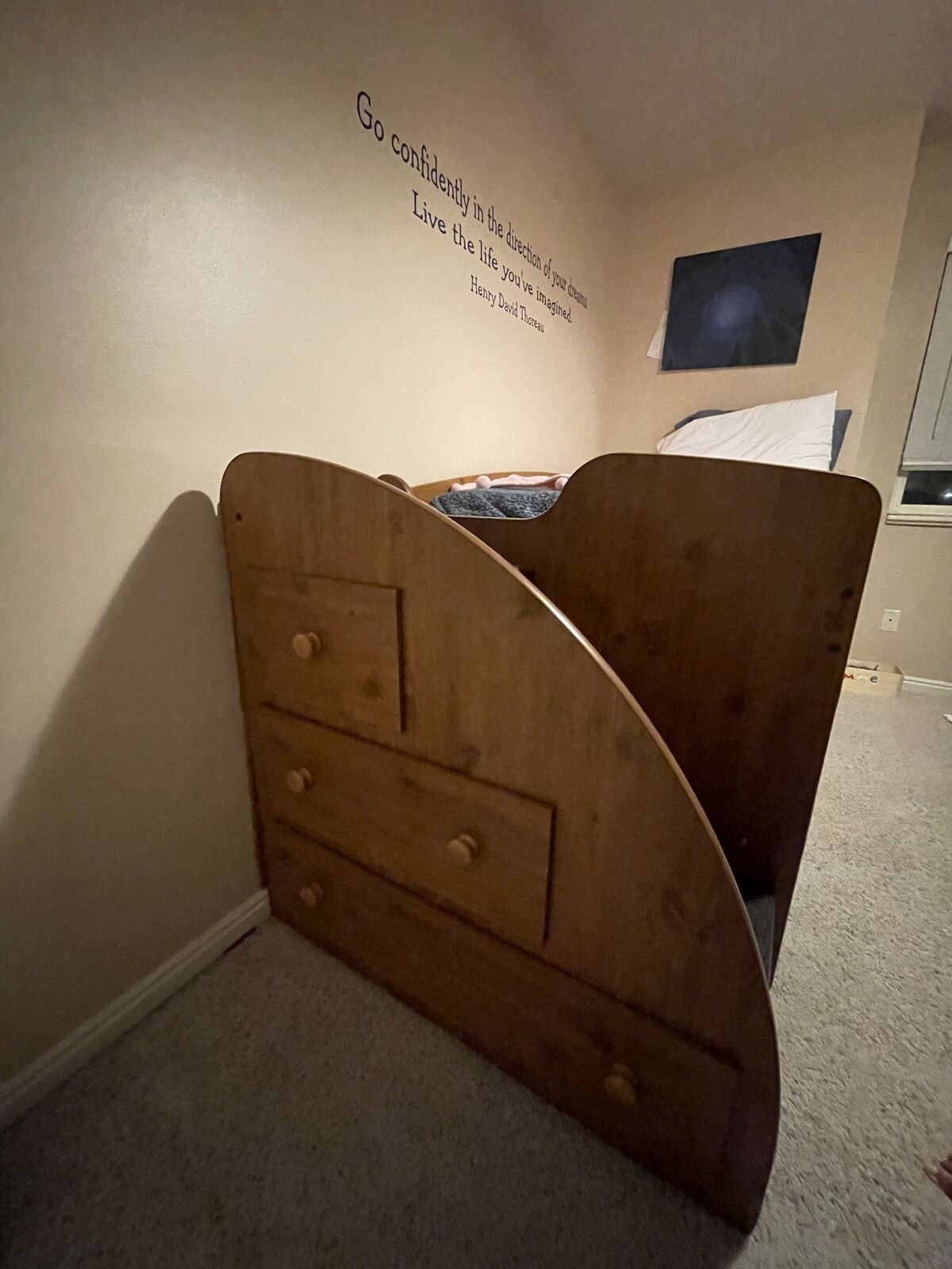 Used, in Great condition! Spacious alcove, would allow for a twin size trundle bed or a small dresser.