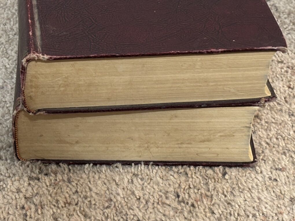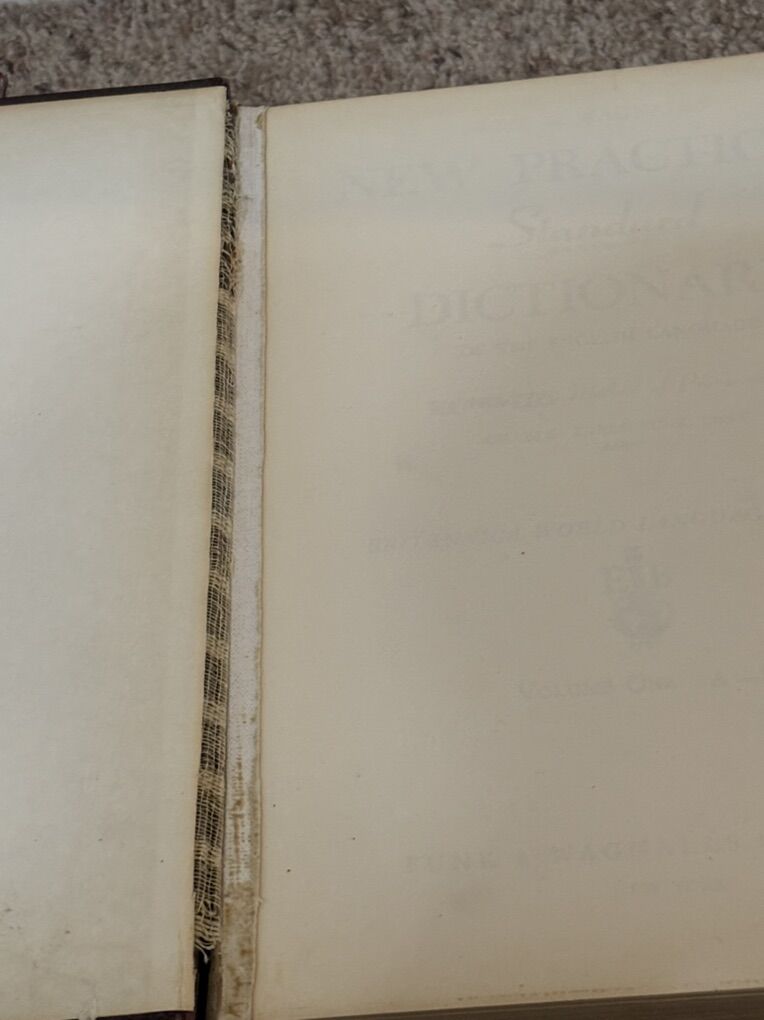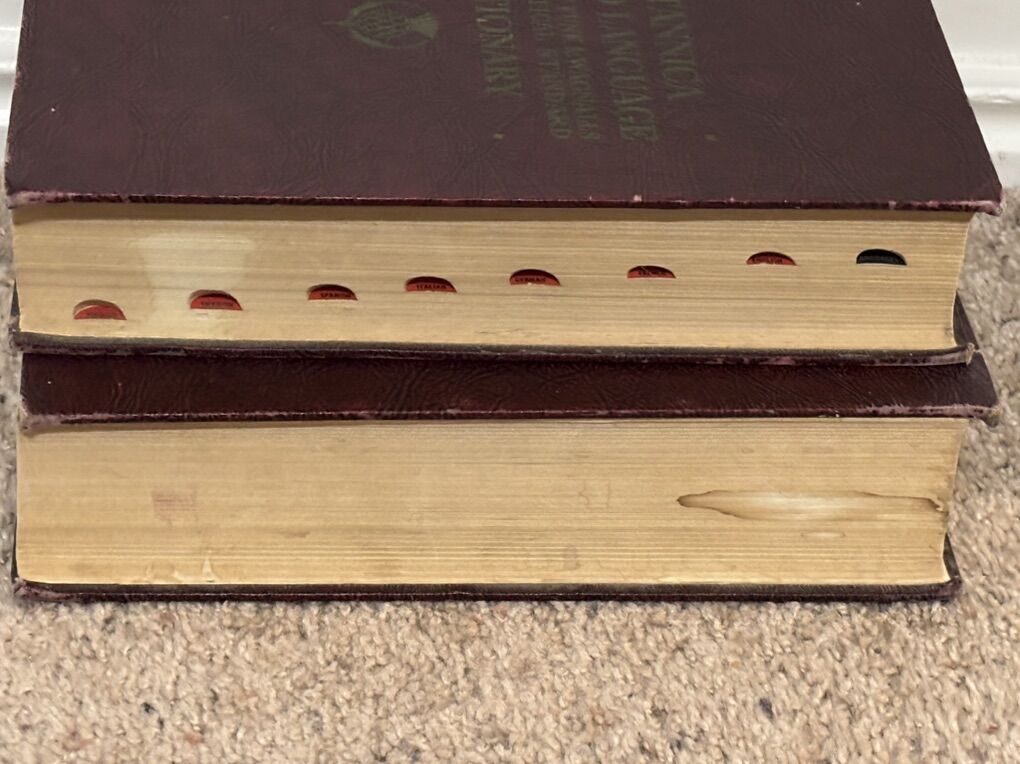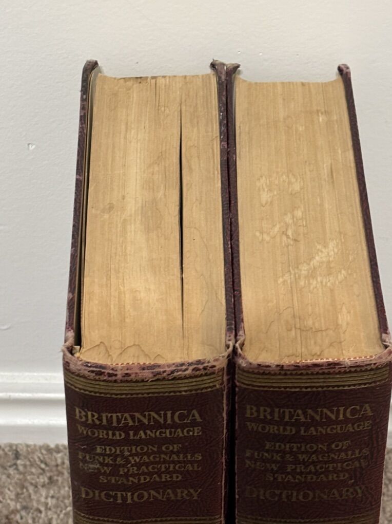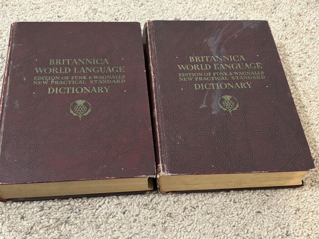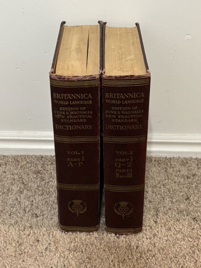 Vintage 2‑Volume Britannica World Language Edition of Funk & Wagnalls New Practical Standard Dictionary – Burgundy Leather‑Bound – Antique Reference Books Beautiful burgundy embossed leather‑like covers with green gold‑foil lettering and thistle emblem.