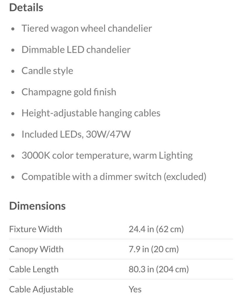 Stunning two-tier wagon wheel chandelier with a champagne gold finish. Features integrated dimmable LED lights with warm 3000K lighting, creating a cozy yet luxurious atmosphere. Perfect for dining rooms, foyers, or living spaces with high ceilings.