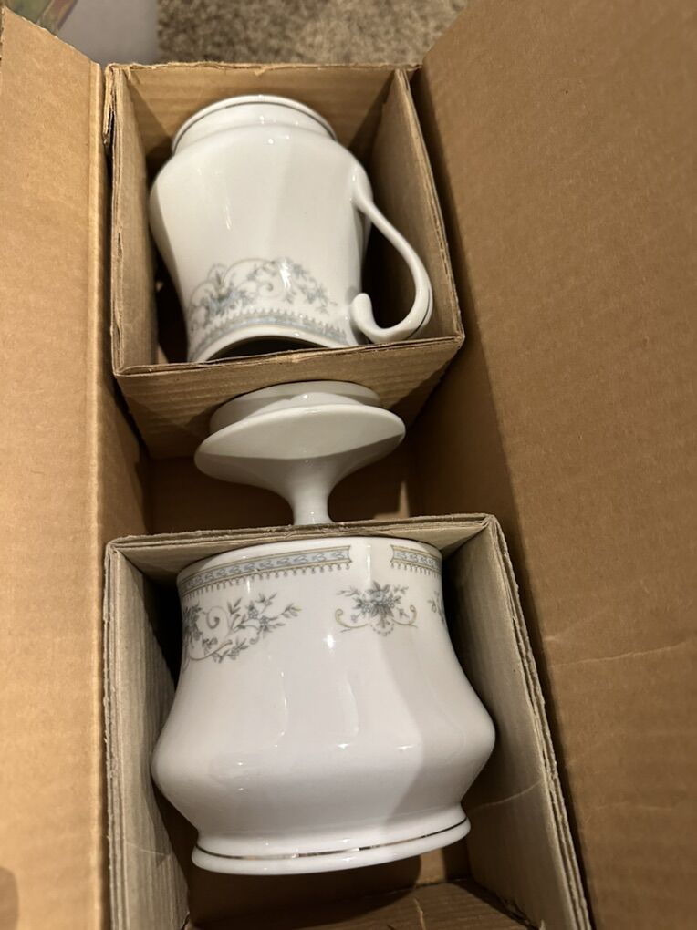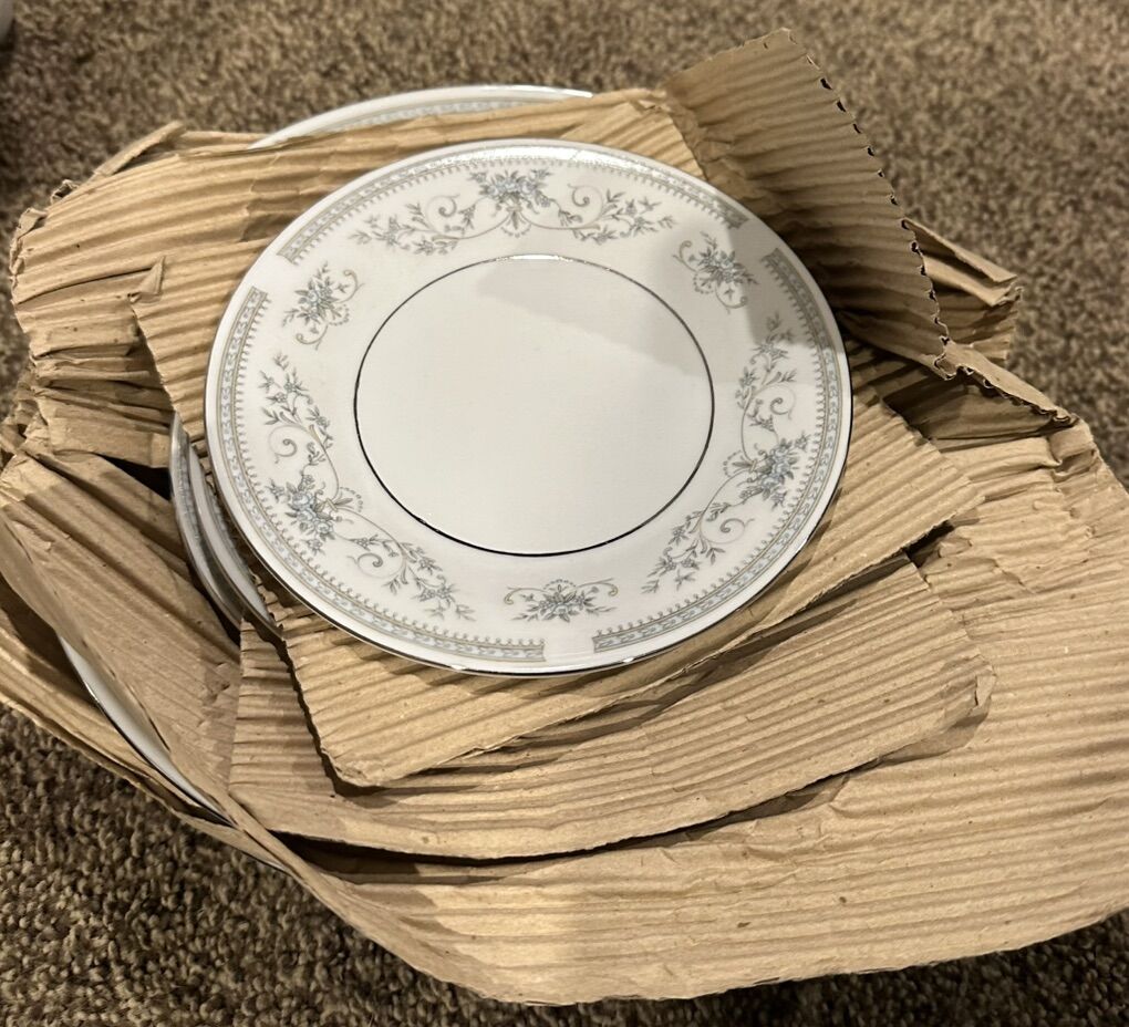 PayPalThis is a brand new set of China Pearl Star Light pattern. The pattern consist of a light blue band and flowers and gray leaves on a white background with platinum trim. This is a service for 12. 78 pieces. 1986 pattern. All pieces are accounted for and still in the box. Never been used. The box has some wear from being stored.
