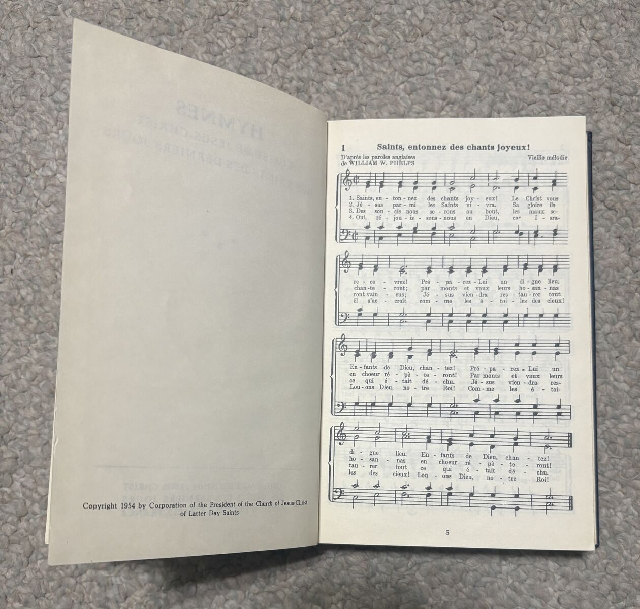 VenmoHymnes” — a French-language hymnbook from The Church of Jesus Christ of Latter-day Saints (Église de Jésus-Christ des Saints des Derniers Jours). Hardcover copy with hymn lyrics and musical notation throughout. Copyright 1954.