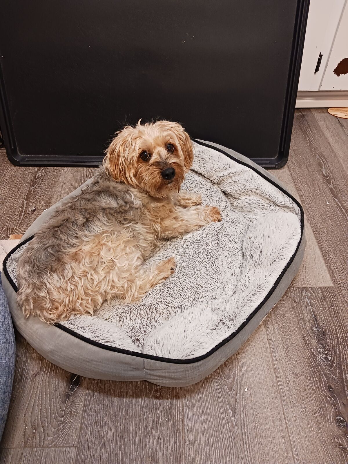 He has his own wire crate and bed. He's housetrained and he learned to use our doggy door within a few days. Health and vet records are solid. Neutered. Doesn't pull on leash or mark in the house.