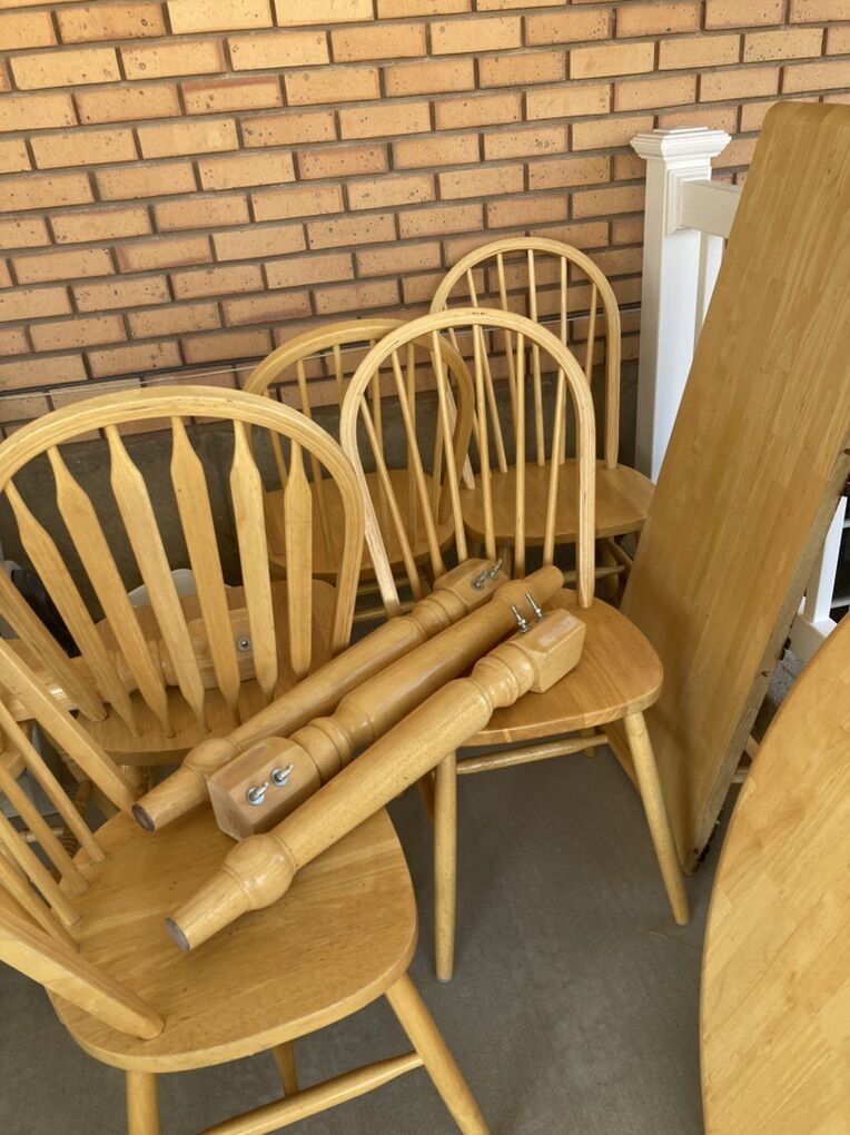 VenmoSolid wood, stable kitchen table, 6 chairs and one 48”x18” leaf. Table is 48” round without the leaf, standard height. It does have a few scratches, see pictures, but in good shape other than that. Table is currently taken apart, we have all the hardware.