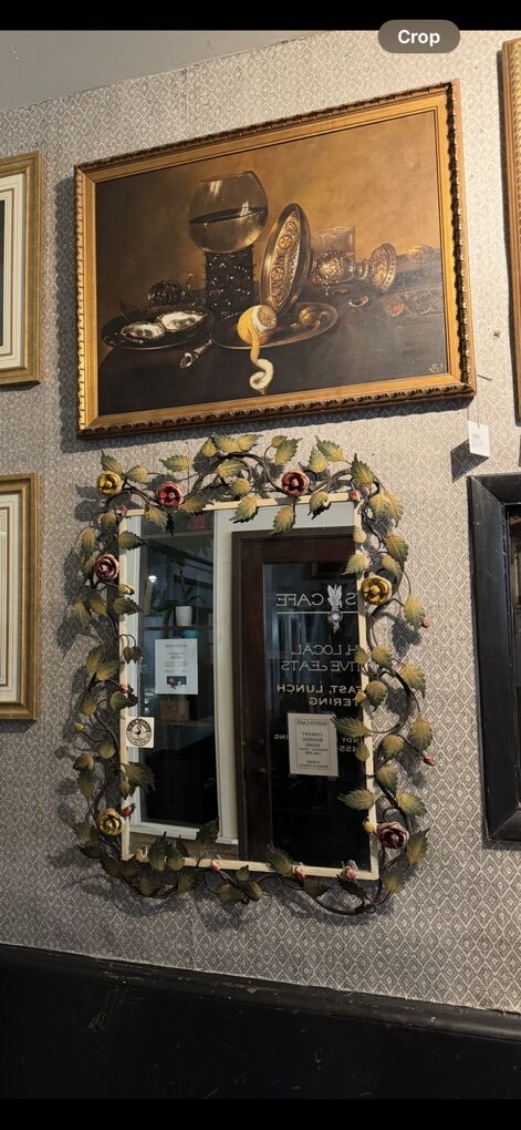 This mirror is an absolute stunner, it’s is from the 1950-1960s. It is all metal with roses and is all hand painted. There is a bit of age to the paint but it adds to the character of the piece. She is heavy and gorgeous. No scratches or flaws in the mirror itself.