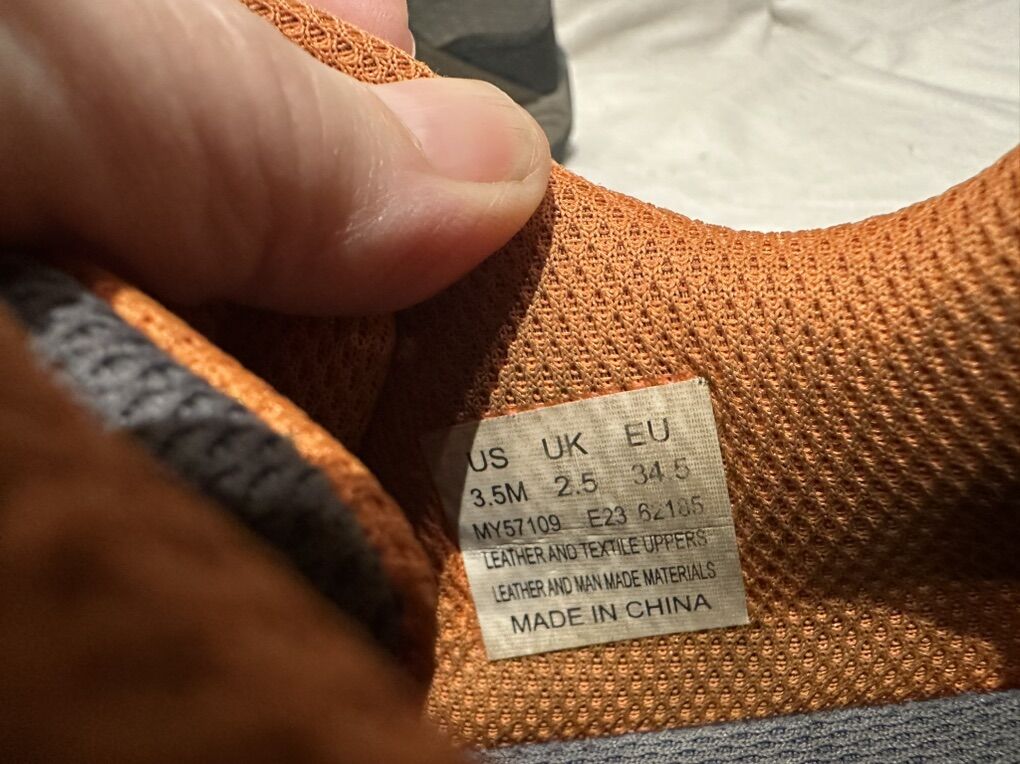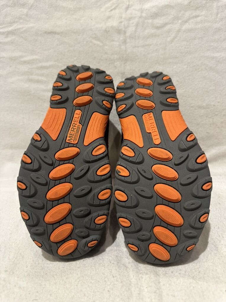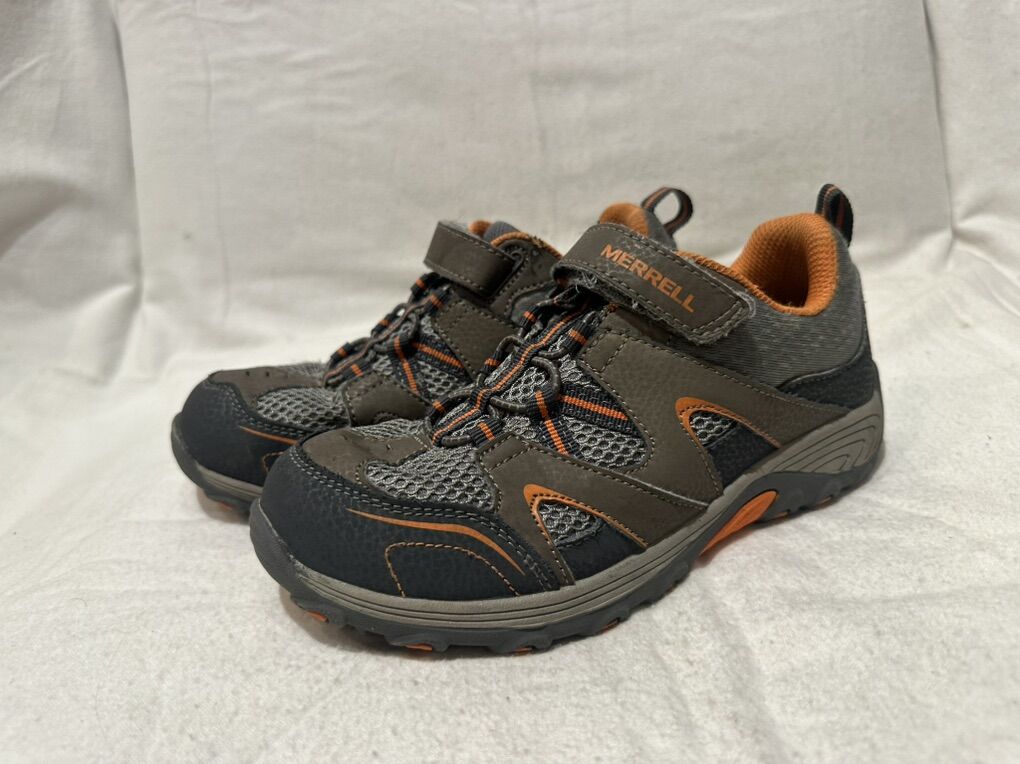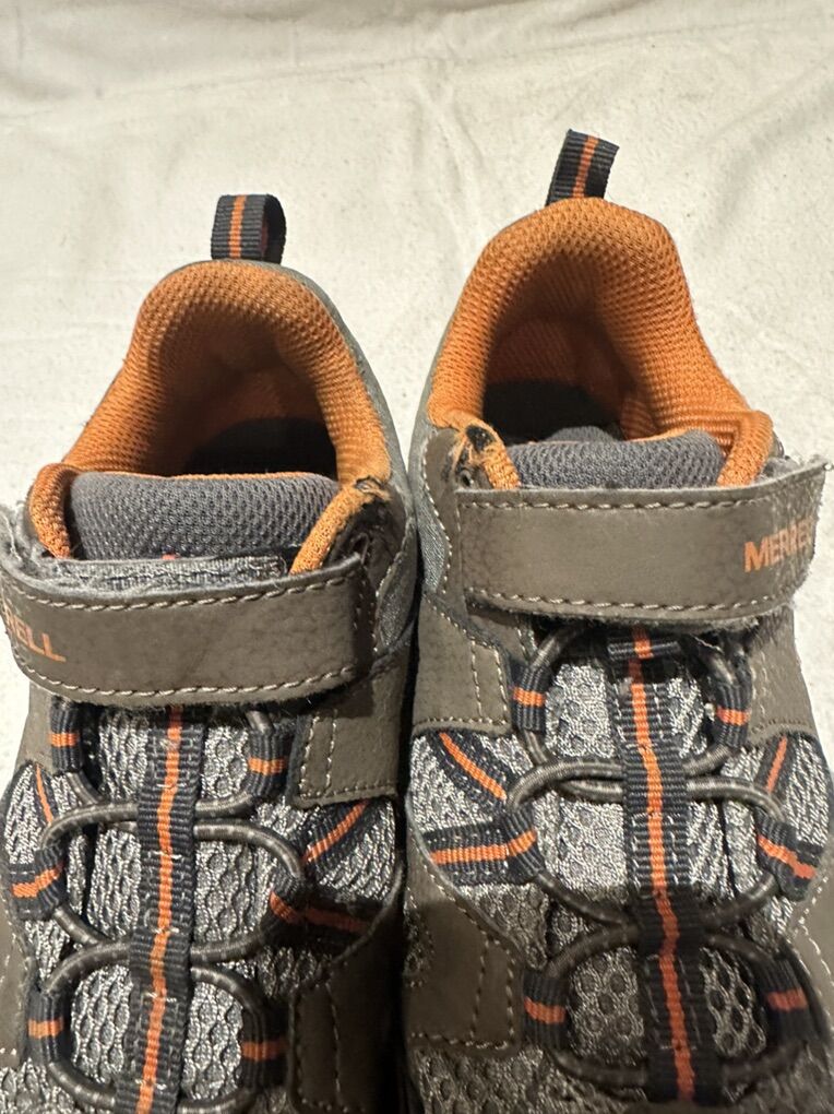 Merrell youth size 3.5 grey with orange trim, leather and mesh hiking shoes. These have the elastic places with a Velcro strap at the top. There are a couple of abrasions around the top ankle inside. See photos for details. I take cash or Venmo, but cash is preferred. Text is best. 801-201-4446. Check out my other ads for additional sizes and styles.