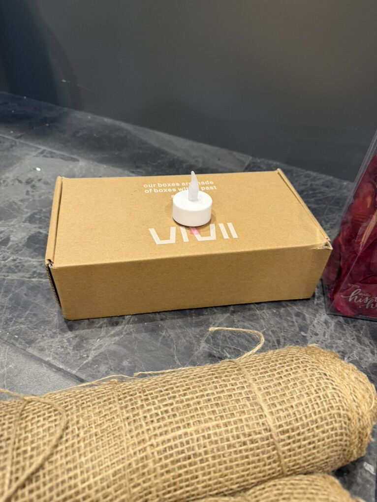 Jute cord -3 rolls T lights 16 Rose petal -2 boxes Wood center pieces 12 big 2 small bags 50 dollars of value , will take 40 cash or Venmo only