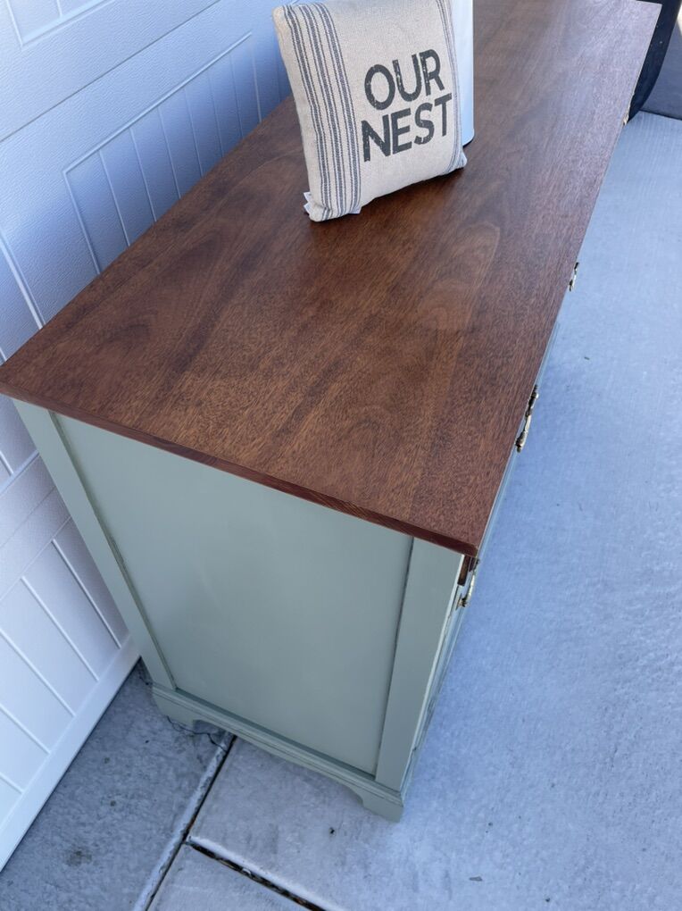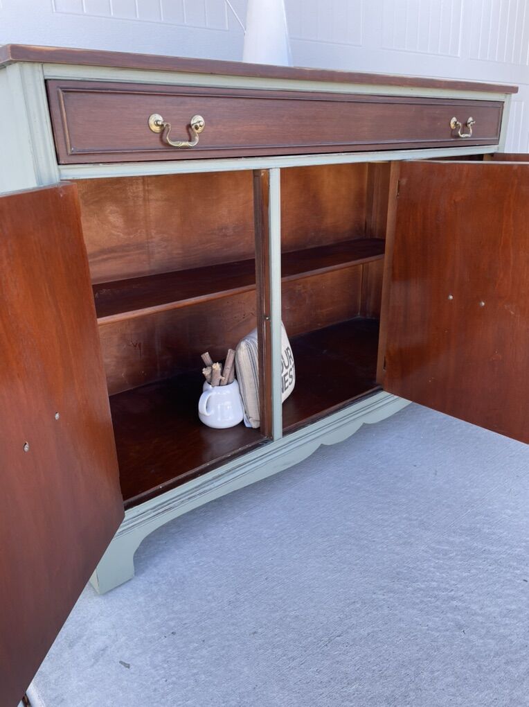 Vintage buffet Painted the perfect green & stained walnut Solid and sturdy Doors open to shelves with storage Has a smooth sliding drawer with dovetail joints High quality Original hardware Would be a great dresser, tv stand, entry table $585 in Tooele