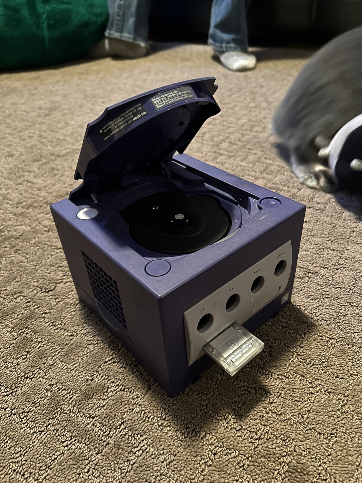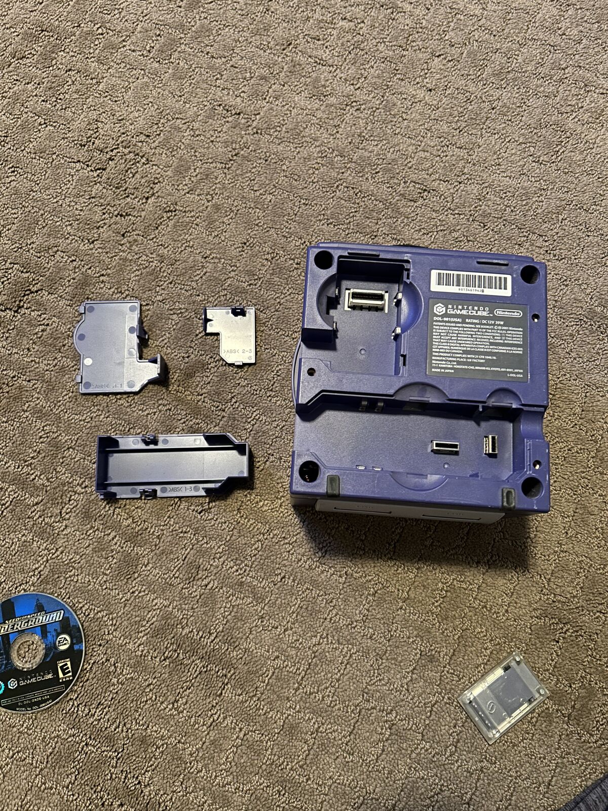 It's in the name. A GameCube that's in moderate condition that comes with a game cd with NO CONTROLLERS OR CABLES. One thing of note is that it comes with some other type of cartridge. I've been told it's a "memory cartridge" but I don't really know.