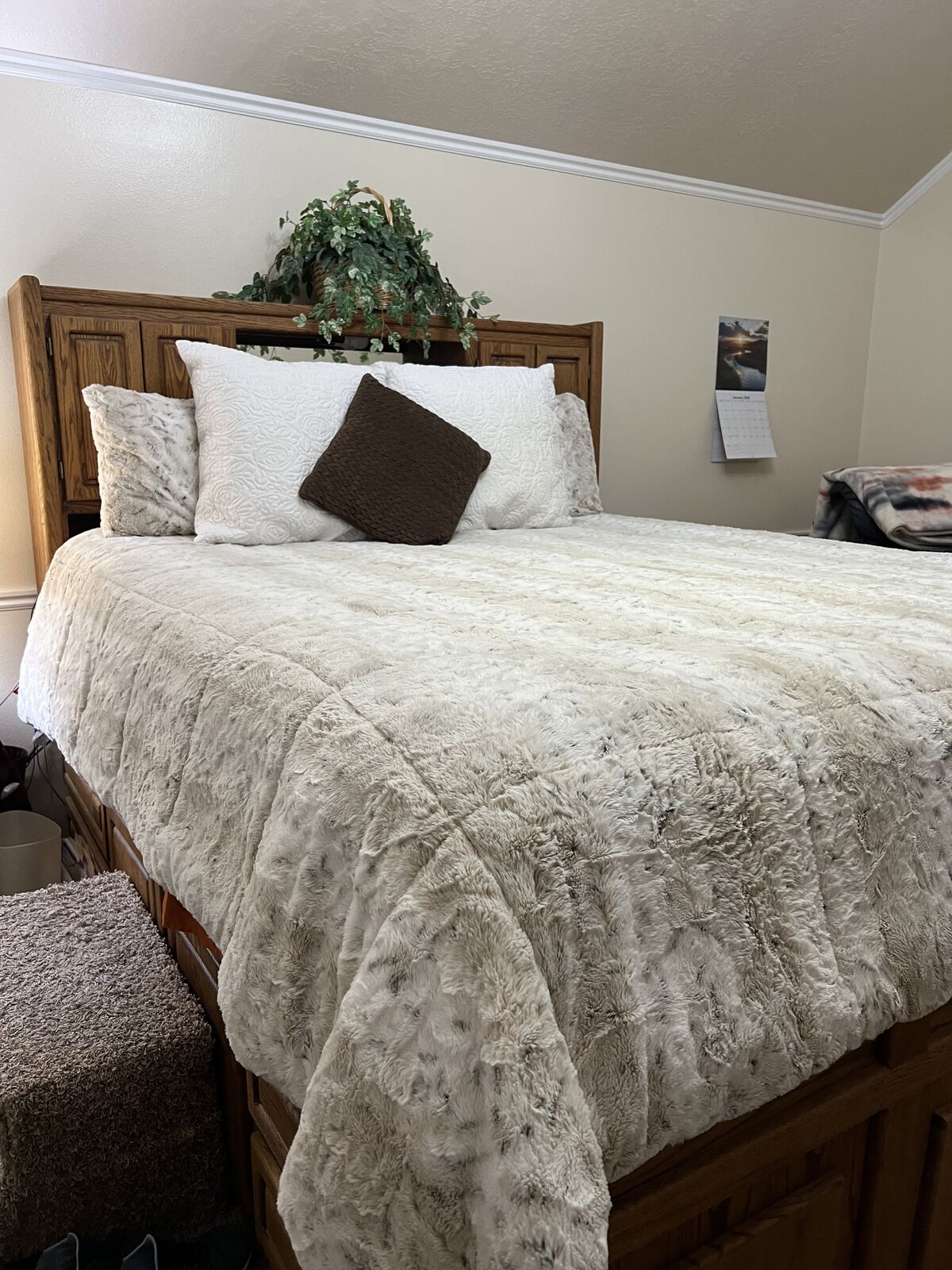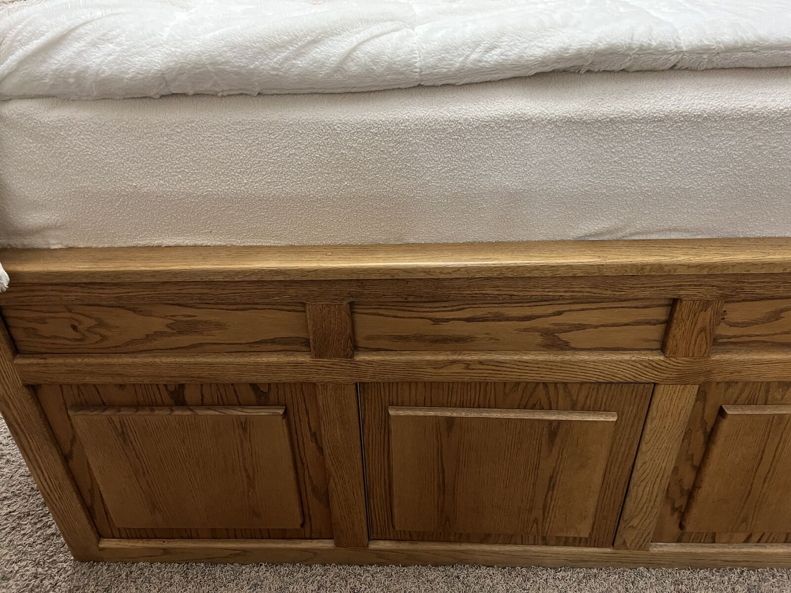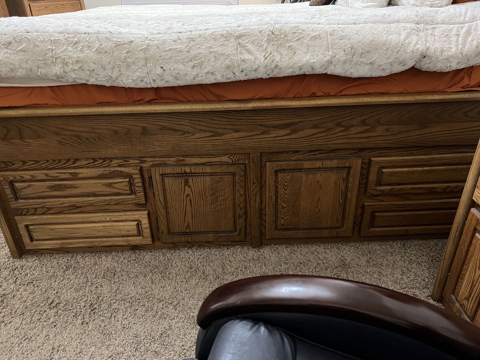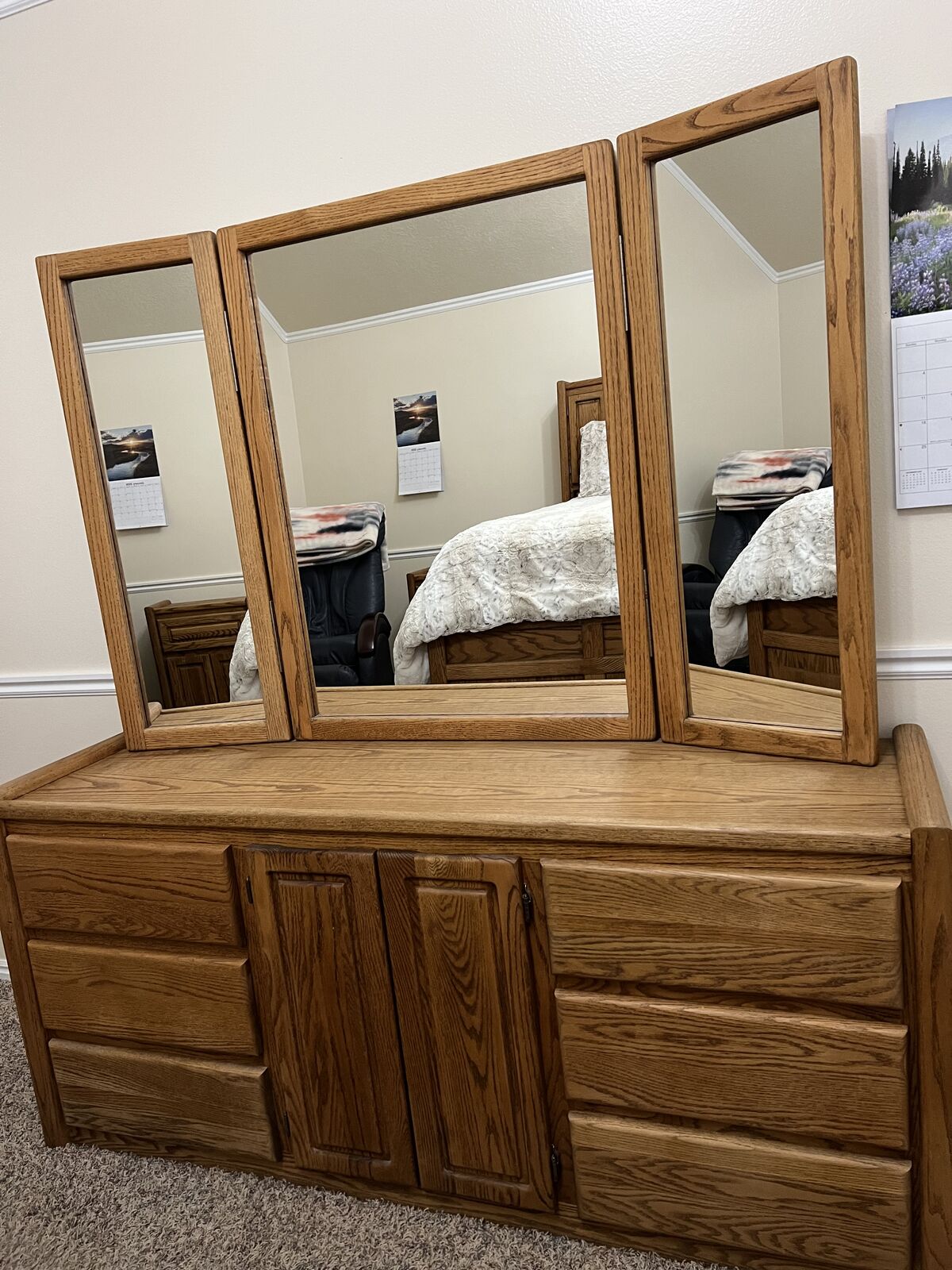 VenmoLarge bookcase headboard. Bed sits on 8 dawer, 5 cupboard pedestal. 2 matching nightstands, 5 drawer chest, large dresser with 3 mirrors. $1200.00 or best offer.