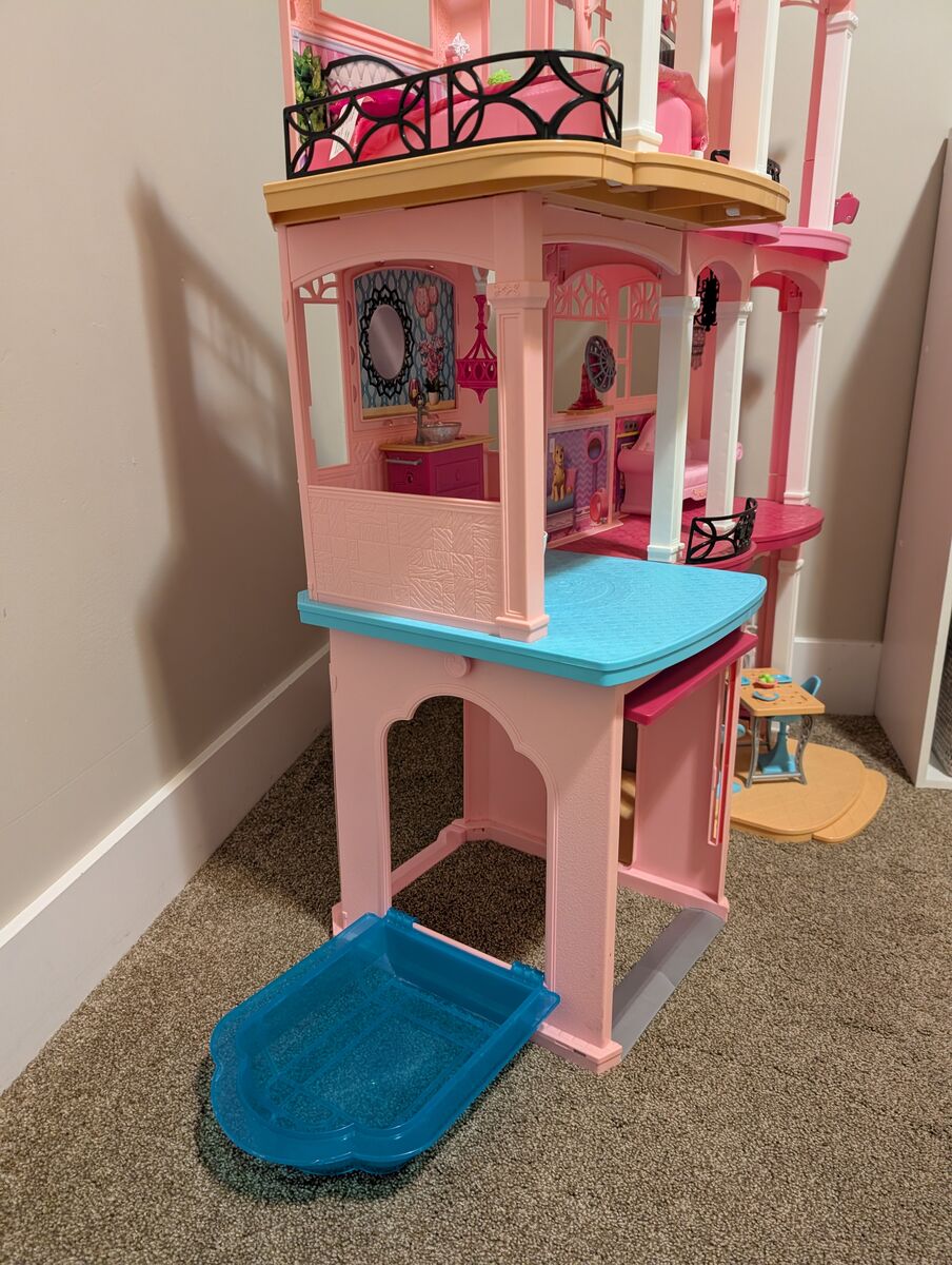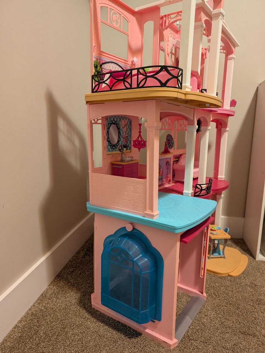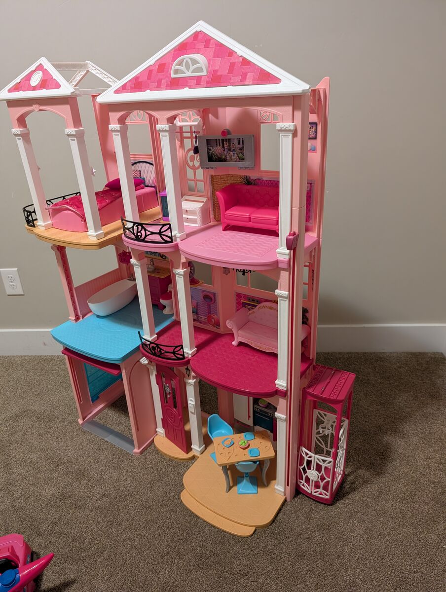 VenmoReally cute and pretty 3 story Barbie dream house. Everything works. Comes with furniture and kitchen items. About 48" tall by 42" wide