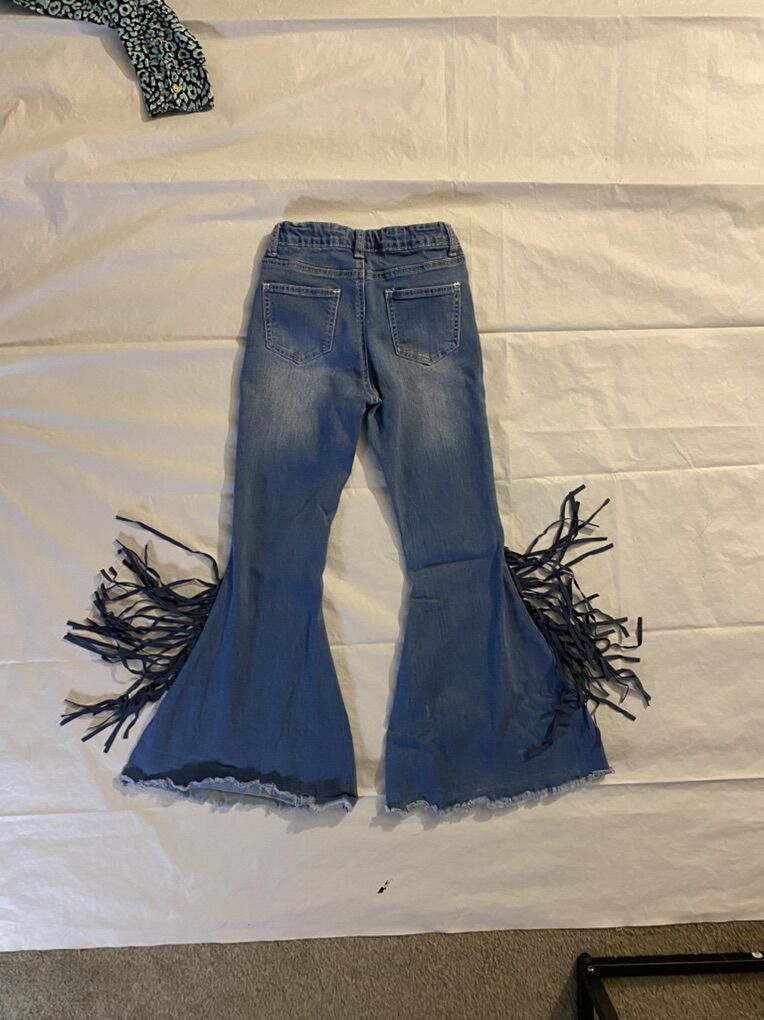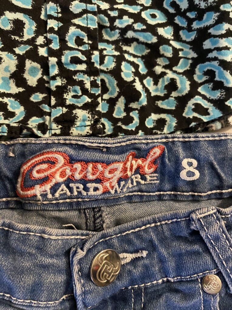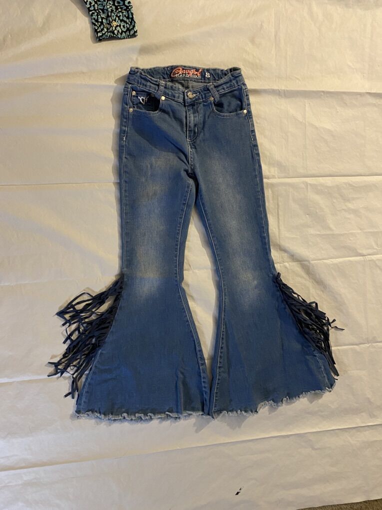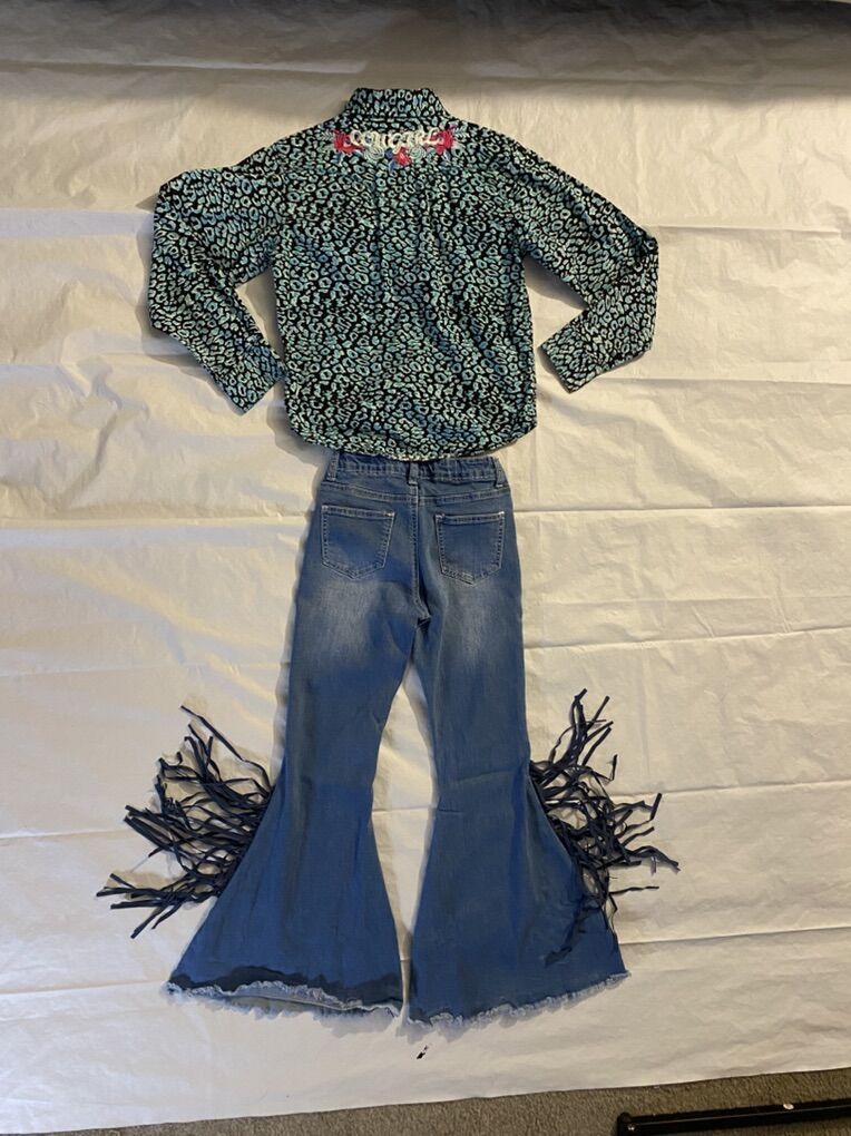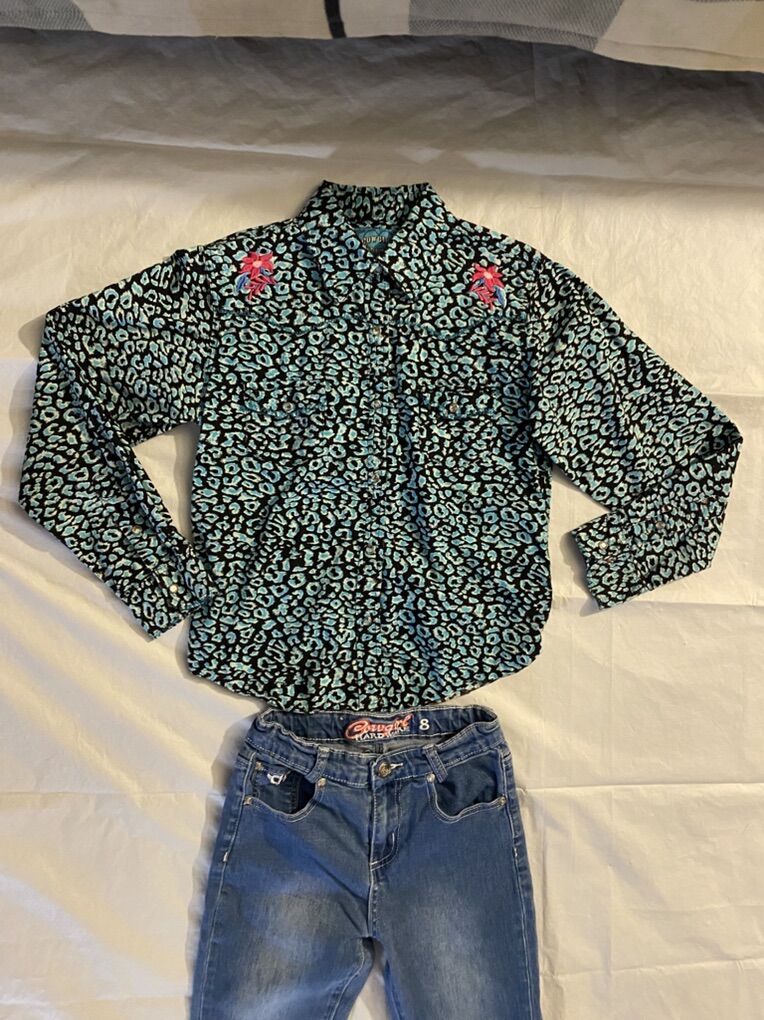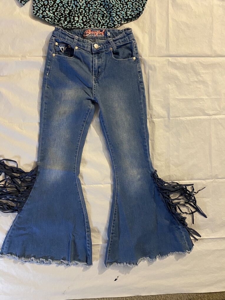 ApplePayThe Cowgirl Hardware Western Leopard Embroidered Pearl Snap Girls Large & Flare Leg Jeans with Side Fringe Girls Size 8 are a stylish and trendy addition to any woman's wardrobe. Made from 100% cotton in a classic blue color, these jeans feature a flattering snap closure and a collared neckline. The embroidered accents and Western theme add a touch of flair to the regular fit, making them perfect for casual occasions year-round. With long sleeves and a button-up style, these jeans offer both comfort and style for the modern cowgirl.