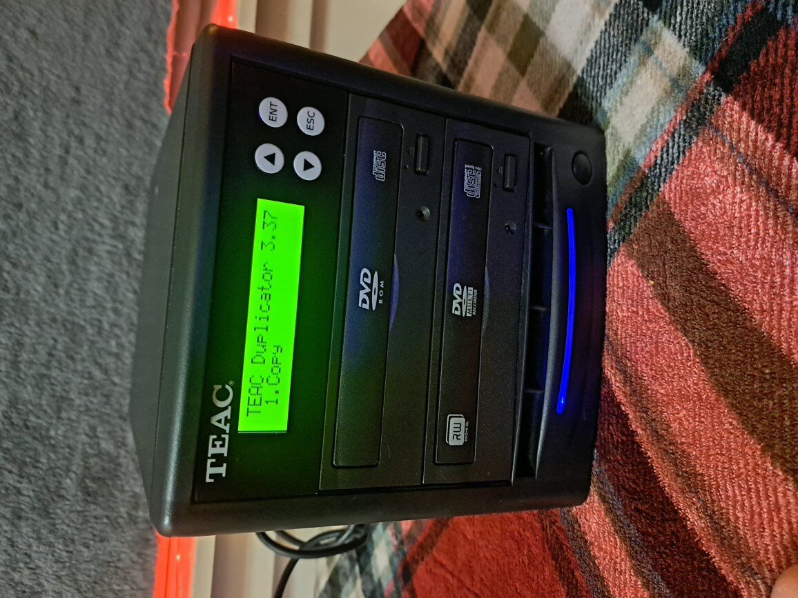 GooglePayThis is a Teac stand-alone CD/DVD duplicator. It allows for the duplication of CDs and DVDs without the need for a computer connection. The device has multiple drives; a top source drive for the original disc and recorder drives below for blank discs. It supports various writable formats including CD-R, CD-RW, DVD-R, and DVD+RW. Some models of this type of duplicator can create custom compilation CDs from multiple source CDs. asking $80 obo open to trades also