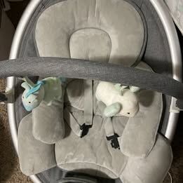 VenmoBabybond electric baby swing, can use with AA batteries, plays music, 3 seat positions, 5 point harness belt, 5 speeds and timer.