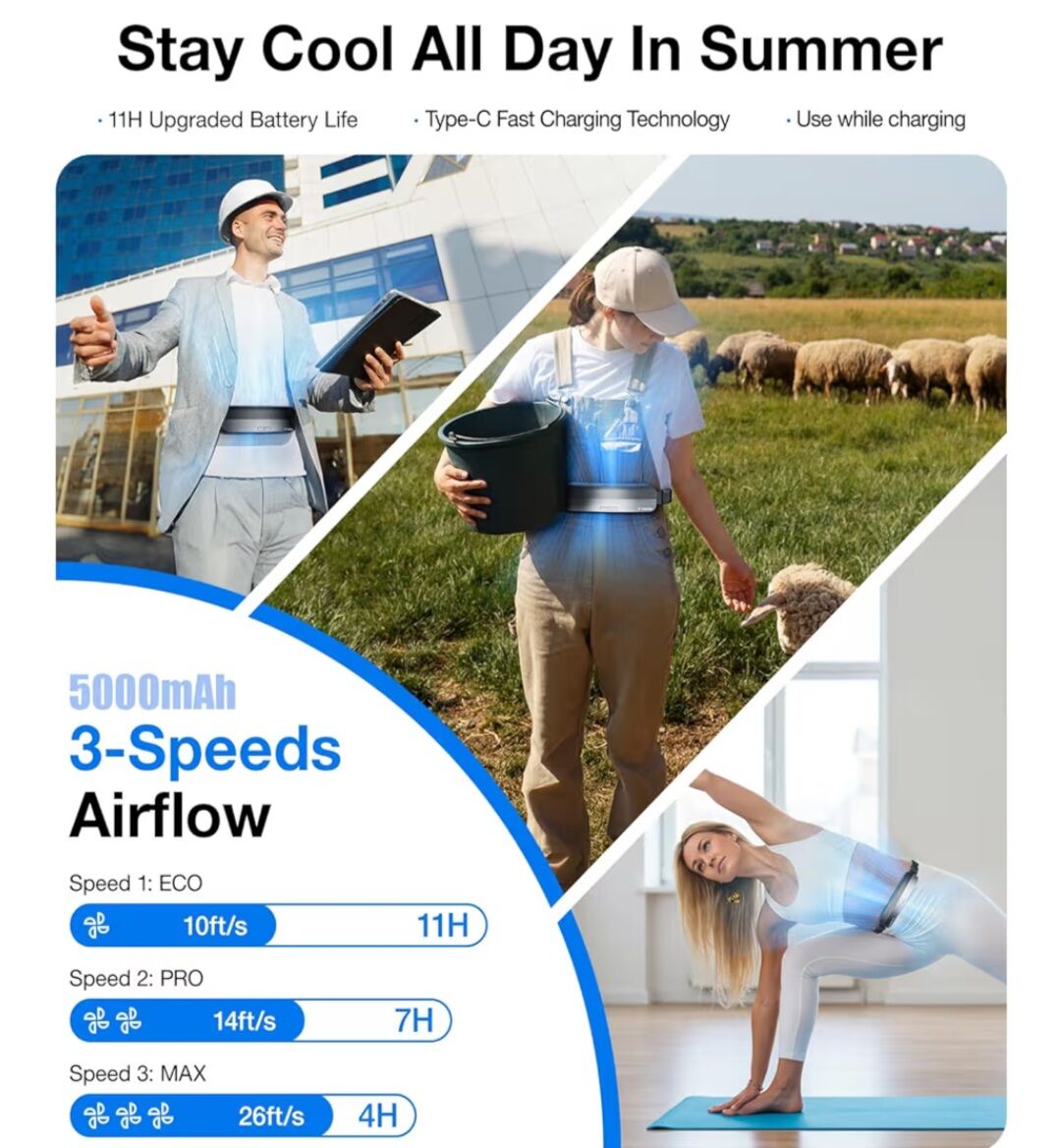 Great fan for any athletic events, great for grandparents to wear so they don't get too hot. Cordless and rechargeable. This item is new in box. Retails $100.