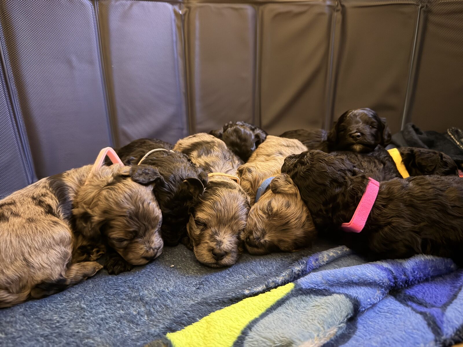 Puppy love is in the air! Update: Six puppies left and ready to go to their new homes. If you’re still interested, we’d love to hear from you—these cuties won’t last long! Our precious Mini Aussie Doodle puppies—3 boys and 3 girls—will be ready for their fur-ever homes on Valentine’s Day. The perfect gift for your special someone (or yourself ). Sweet, cuddly, and already stealing hearts! Message me to set up a meet-and-greet with these cutie pies Introducing Our Proud Parents & Their Sweet Puppies! Meet Pepper ️ (Momma) — a spunky, intelligent Mini Aussiedoodle with a big personality and an even bigger heart. She’s protective, loyal, and always tuned in to what’s going on around her — the kind of dog that makes you feel safe and loved at the same time. Pepper has minimal shedding from her Aussie coat (no hair-covered clothes or house!), is AMAZING with kids, and has been an absolute natural as a mom to her babies Meet Lucky (Dad) — the goofiest, most lovable Mini Goldendoodle with a heart of pure gold He’s all about fetch, playtime, and running around with kids to burn off energy (theirs and his!). Lucky does not shed at all, thanks to his beautiful poodle coat, and he has that classic, happy-go-lucky golden retriever personality everyone loves. Together, Pepper and Lucky have welcomed 8 precious Mini Aussiedoodle puppies These eight-week-old babies are already so sweet and cuddly. The black puppies appear to be showing more poodle-style coats, while the three blue-Merle, tricolored pups are starting to show more of Pepper’s Aussie influence — the perfect blend of both parents! Looking for the ultimate Valentine’s gift? A puppy makes a forever kind of love. Message me if you’re interested or would like more details — these babies won’t last long!