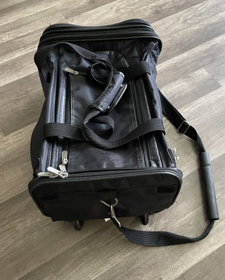 VenmoSherpa Ultimate On Wheels Soft-Sided Pet Carrier. Fits pets up to 22 pounds. Designed to fit under most airplane seats in compliance with FAA regulations. Four mesh wall panels for ventilation, roll down privacy flaps, top and side entry with escape-proof locking zippers, and waterproof interior base. Two front spinner wheels allow for smooth steering in any direction, with two recessed wheels at the rear providing steady motion for safe and comfortable travel with recessed wheels for easy-glide motion. The detachable pull handle can be converted into an adjustable shoulder strap, transforming the rolling carrier into a pet tote or a duffel bag.