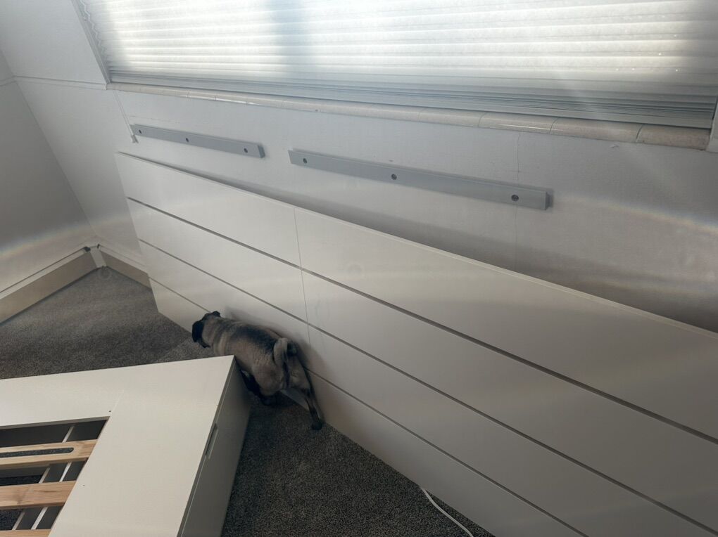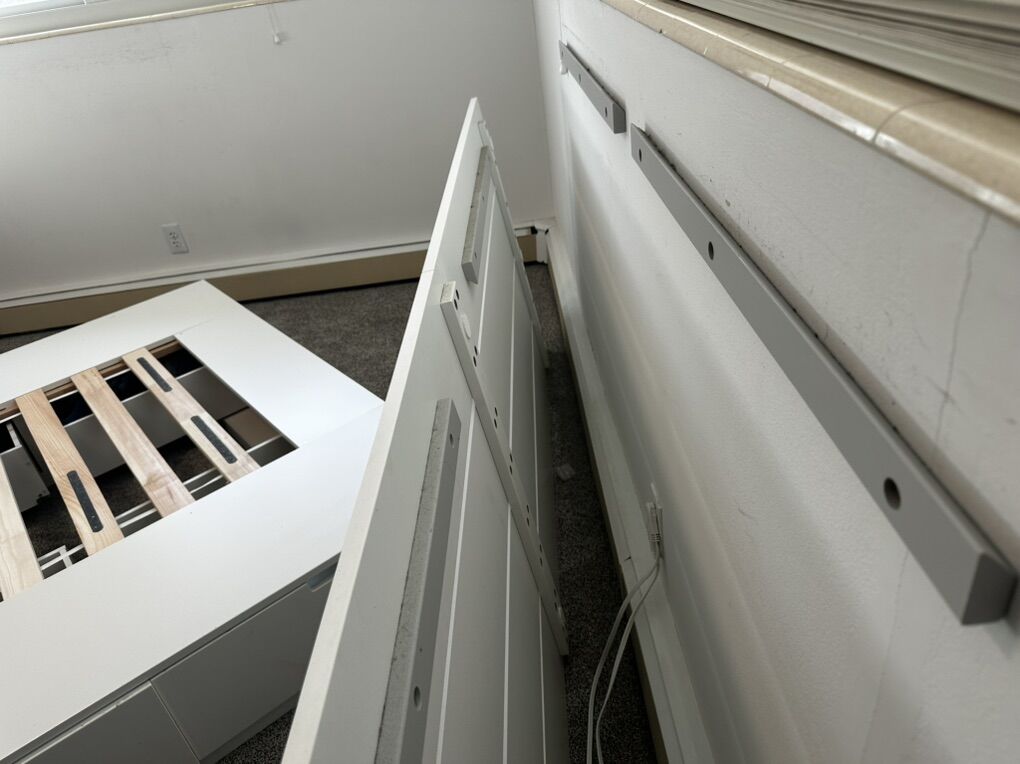 Useful headboard that mounts to the wall with wall cleats; customizable shelves attach via being hung on the wood slats.