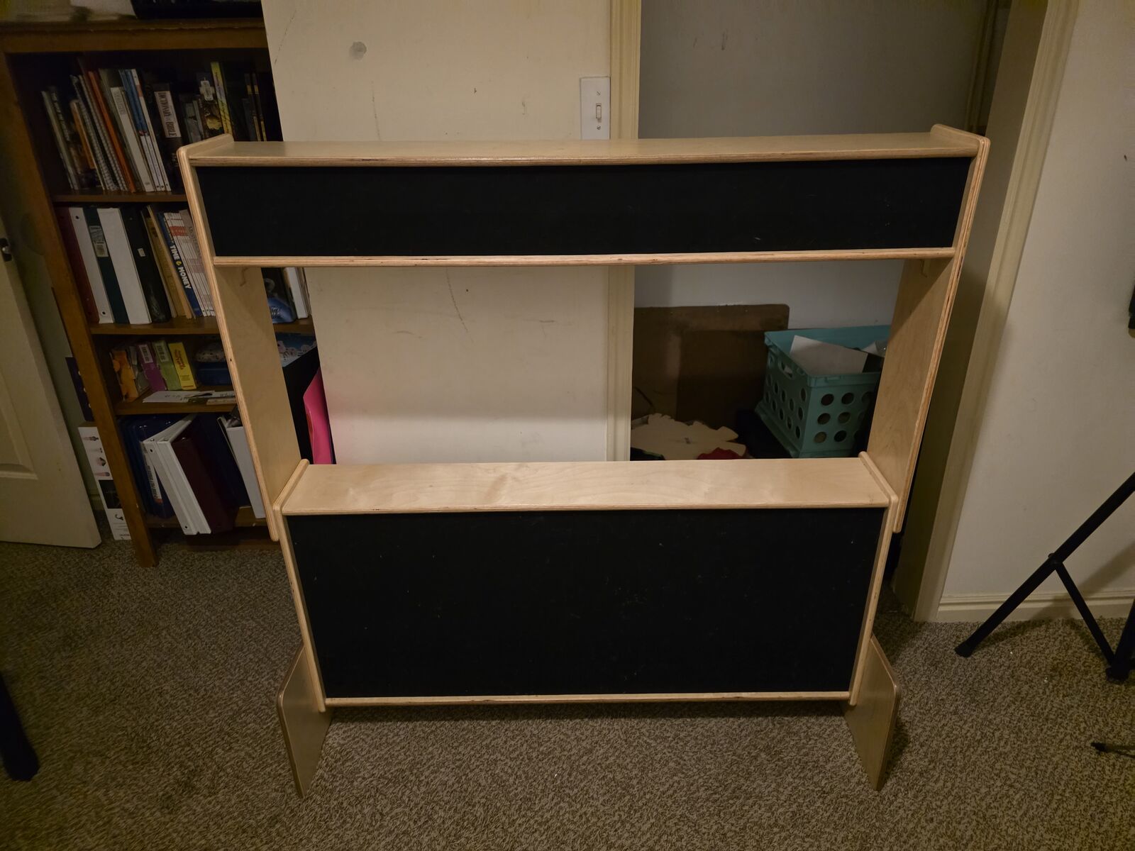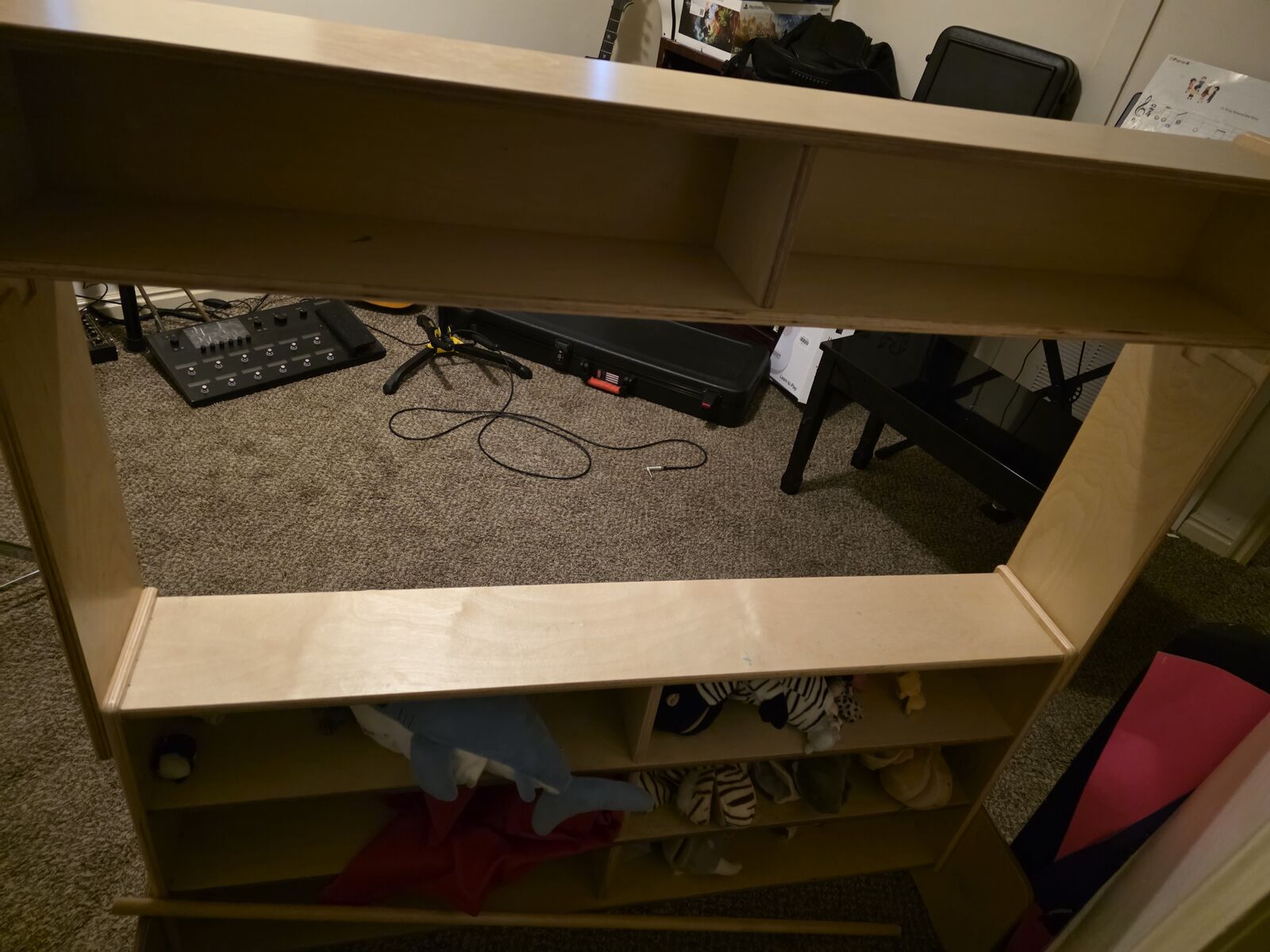 As seen puppet theater with curtains and storage shelves. Big and little puppets...