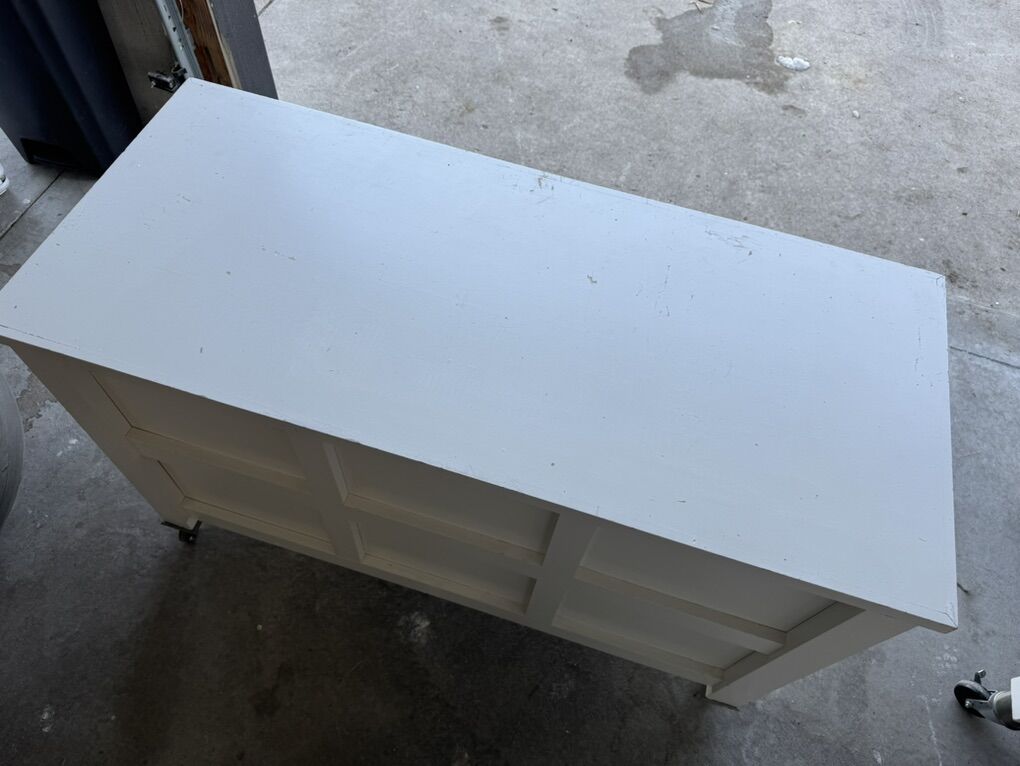 Venmo2 available repurposed retail rolling shelf: 48”L x 21”W x 29”H, wood construction, casters, 2 drawers + open shelves, solid & mobile for workshop/garage/storage. • Good condition with light wear/patina (drawers need minor oil); $price is each OBO