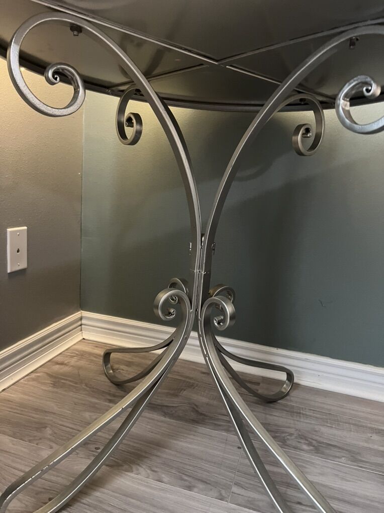 This is a beautiful table used but in great condition, the top is mirror and the frame of it is metal but not super heavy. Can be used in a small dining room or living room or bedroom everything look great on it, I used it for Christmas decor and it sure adds to the room. The diameter of this round table is 24 inches and it is 33 inches tall.