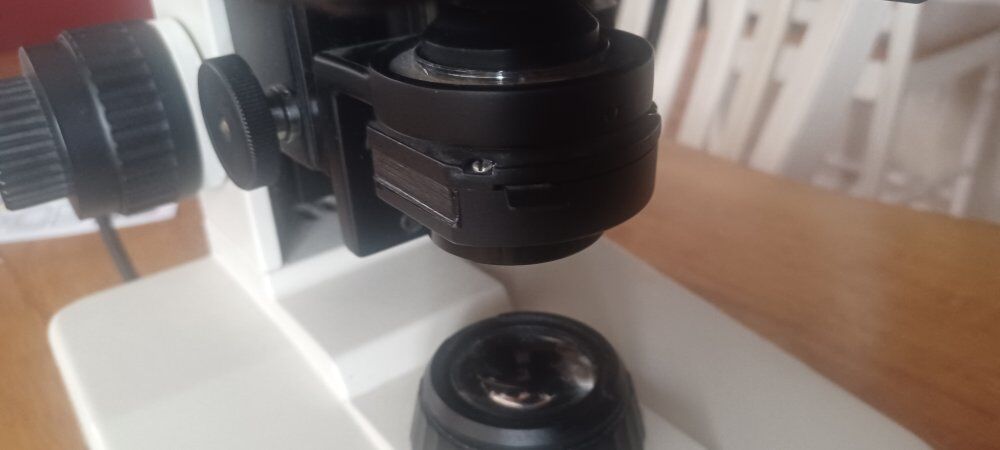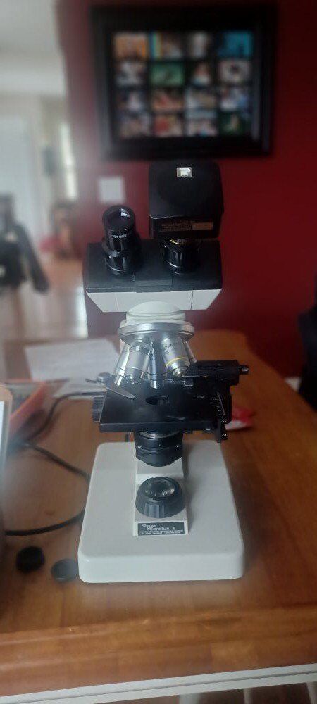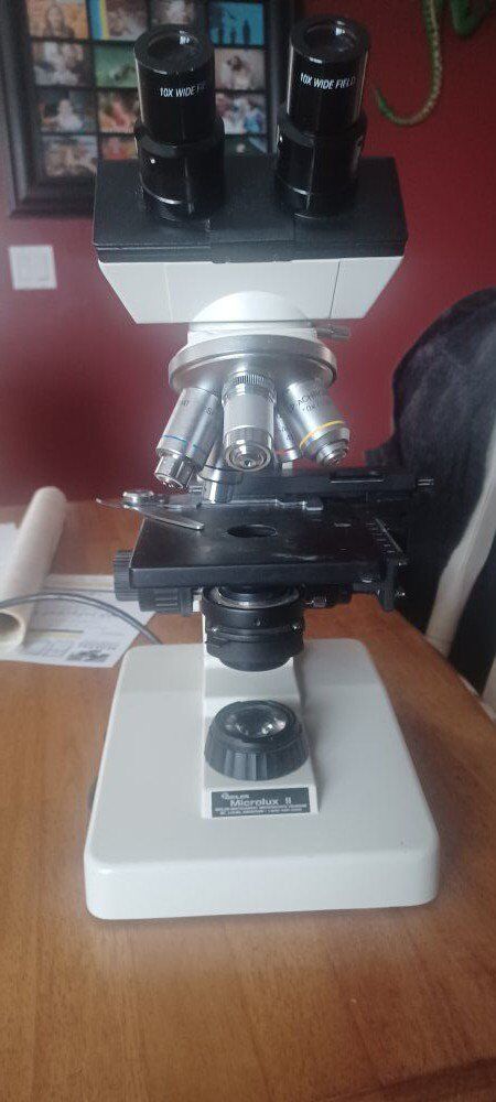 ZelleThis Microlux II has an added darkfield filter slider that allows for better contrast of transparent specimens. the Camera is an Ameriscope 10 MP camera suitable for stationary organisms. The microscope is in good condition except the slide stage cannot move side to side using knob and must be moved manually. But it is still in perfectly usable condition. comes with makeshift dust cover. Excellent mid-range microscope.