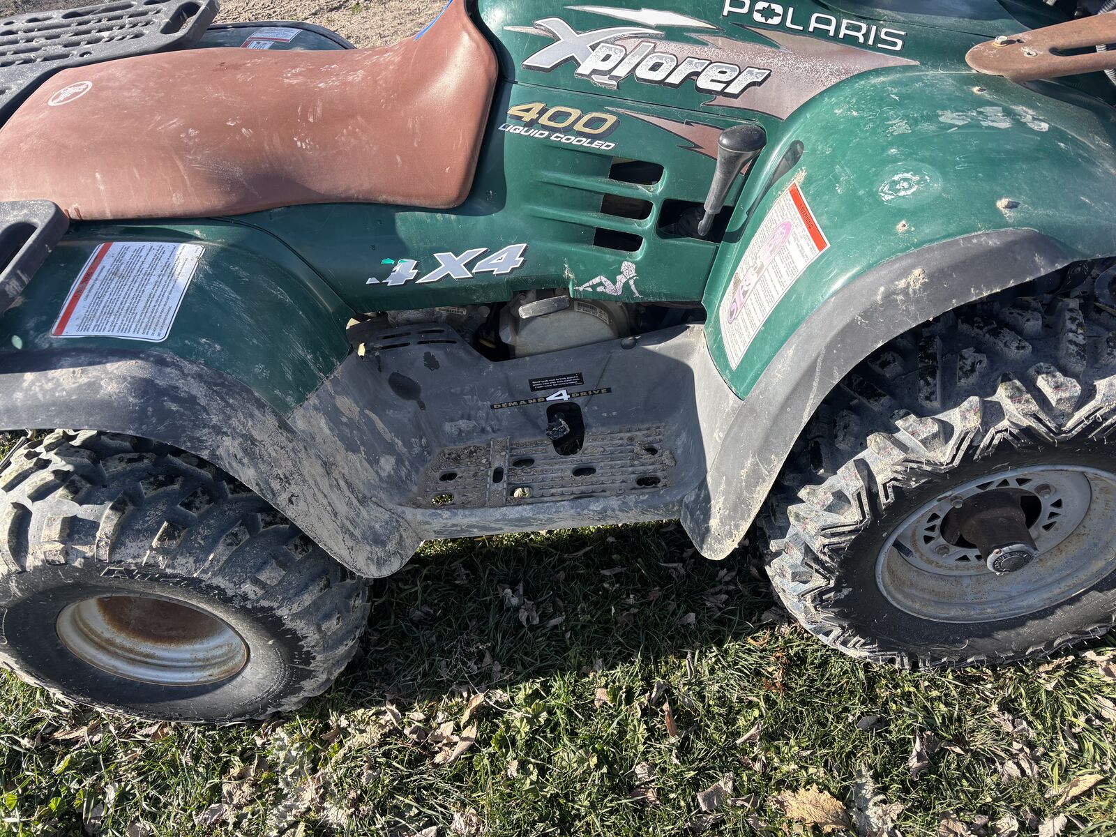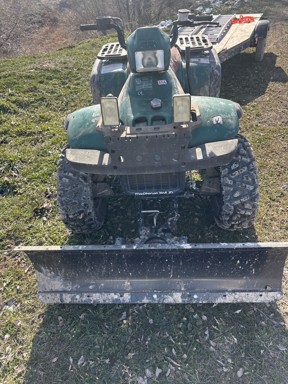 98 Polaris 400 2 stroke electic start an pull start new battery 4wd has high low reverse new front tires has snow plow trailer an ramps have title $2500 have spare tire for trailer