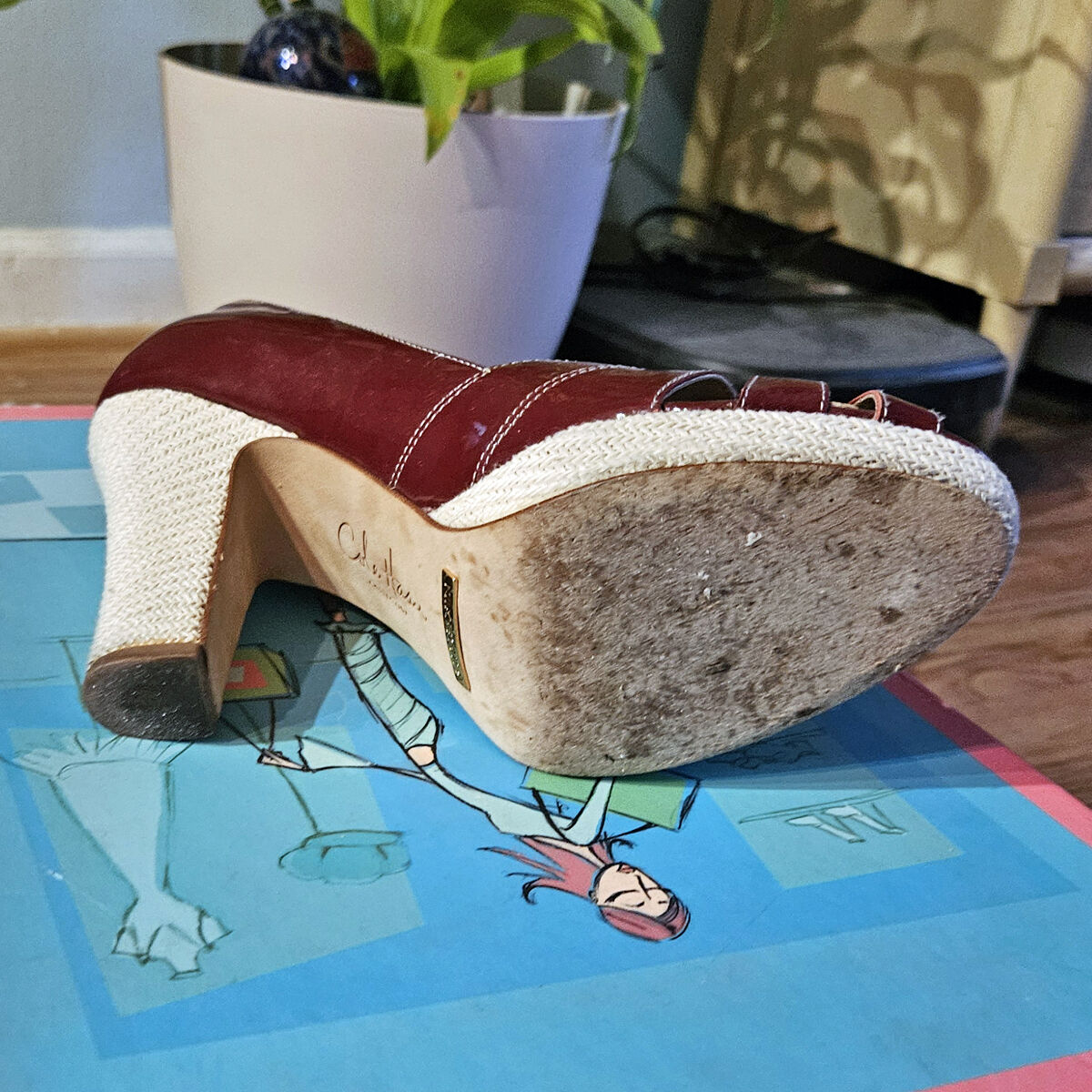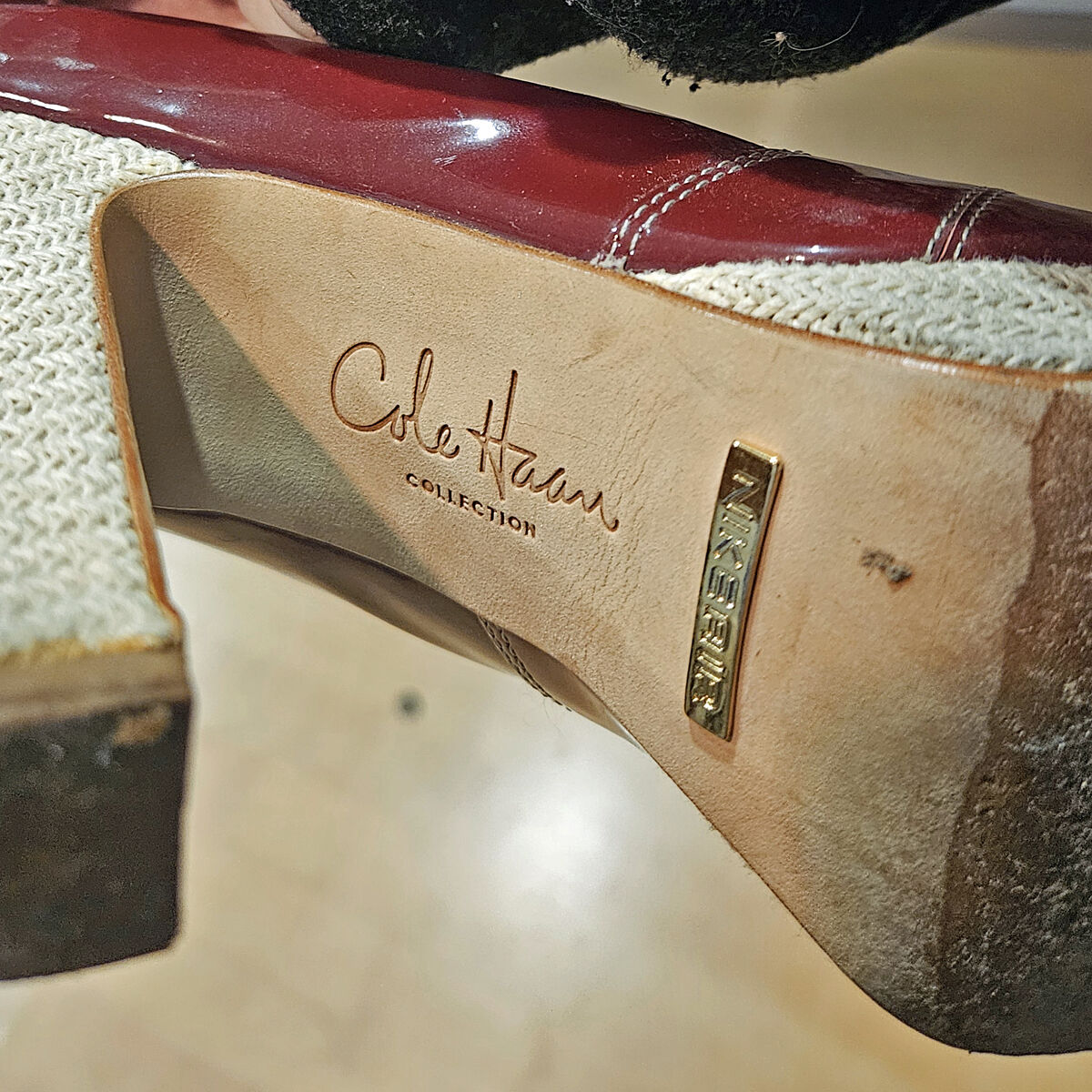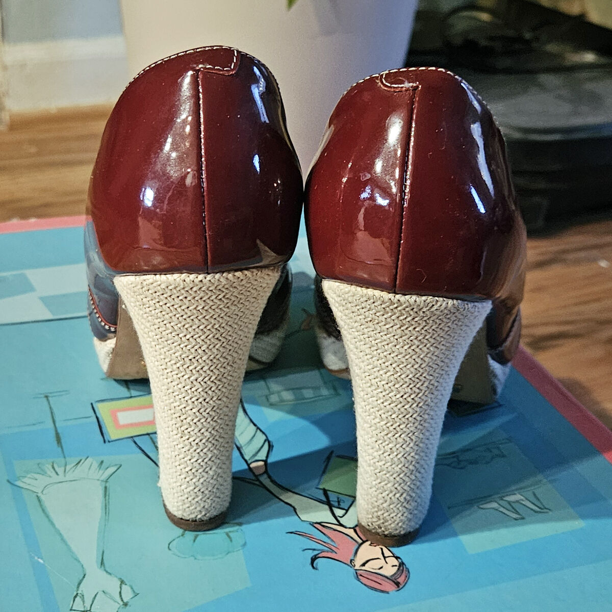 VenmoBeautiful shoe in excellent used condition. Soft patent leather with no scratches on the leather. Open peep-toe pump with finely woven natural-colored fabric covering the platform and heels. Fully leather lined with a padded sock liner and concealed Nike Air cushioning. Nike Air makes this pump very comfortable. Heel height is 4" with a 3/4" platform. Size 8.5