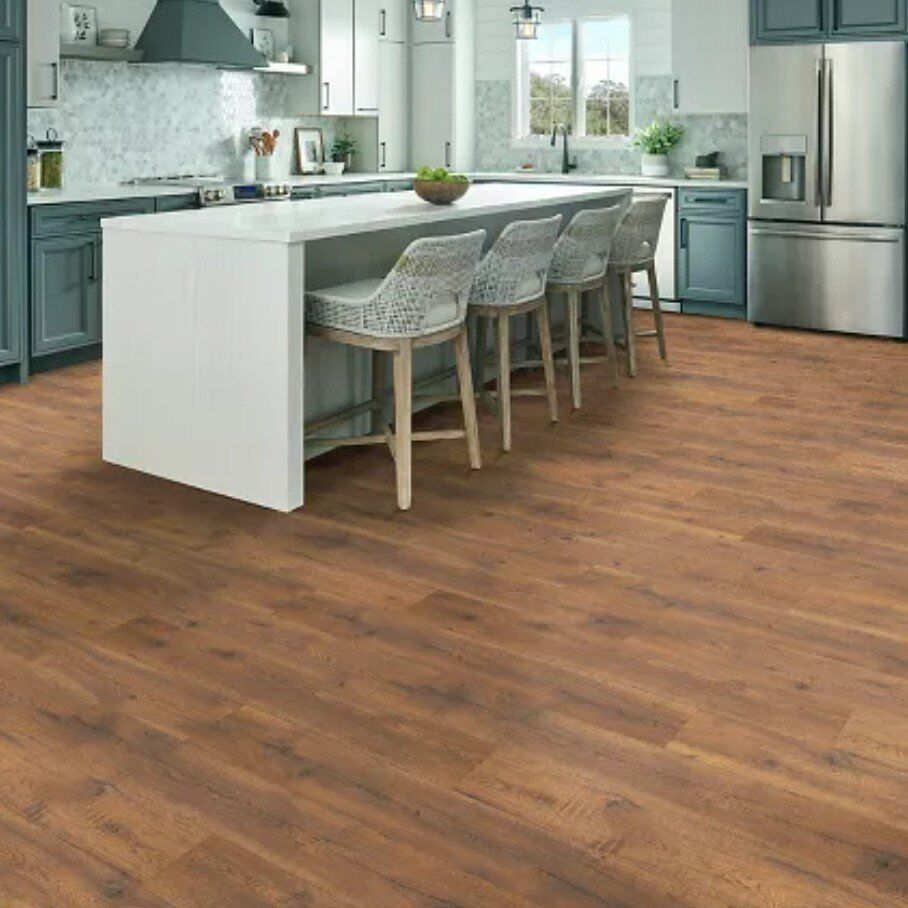 HIGHTLIGHTS Rich brown laminate wood flooring with textured surface Waterproof laminate flooring with a new pet-scratch warranty Antimicrobial protected flooring perfect for the whole home Attached underlayment