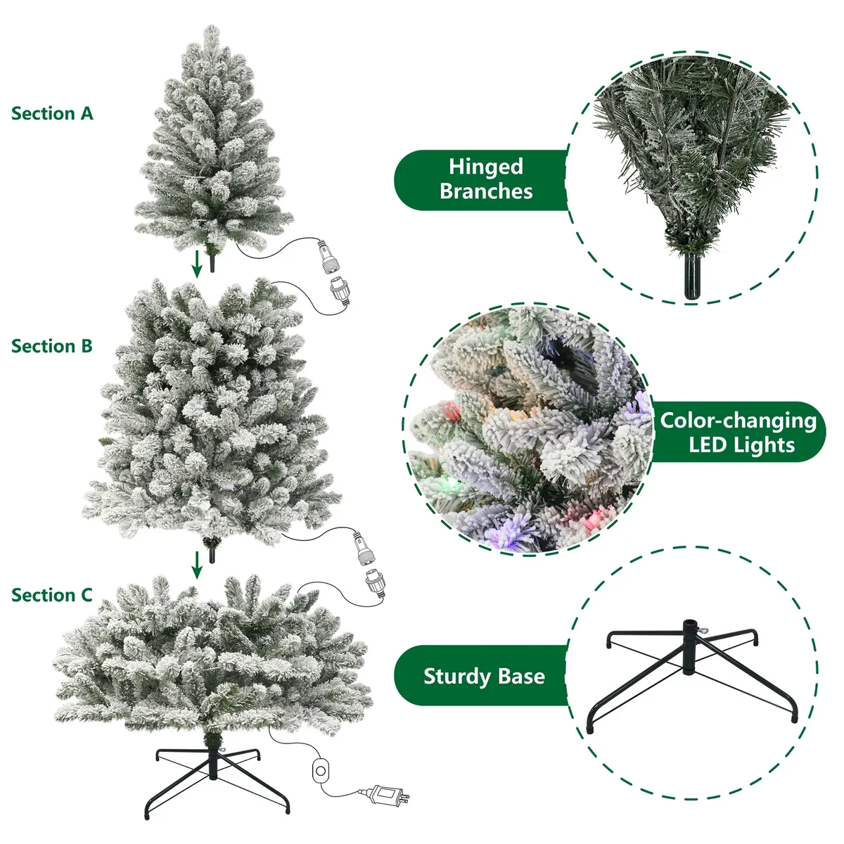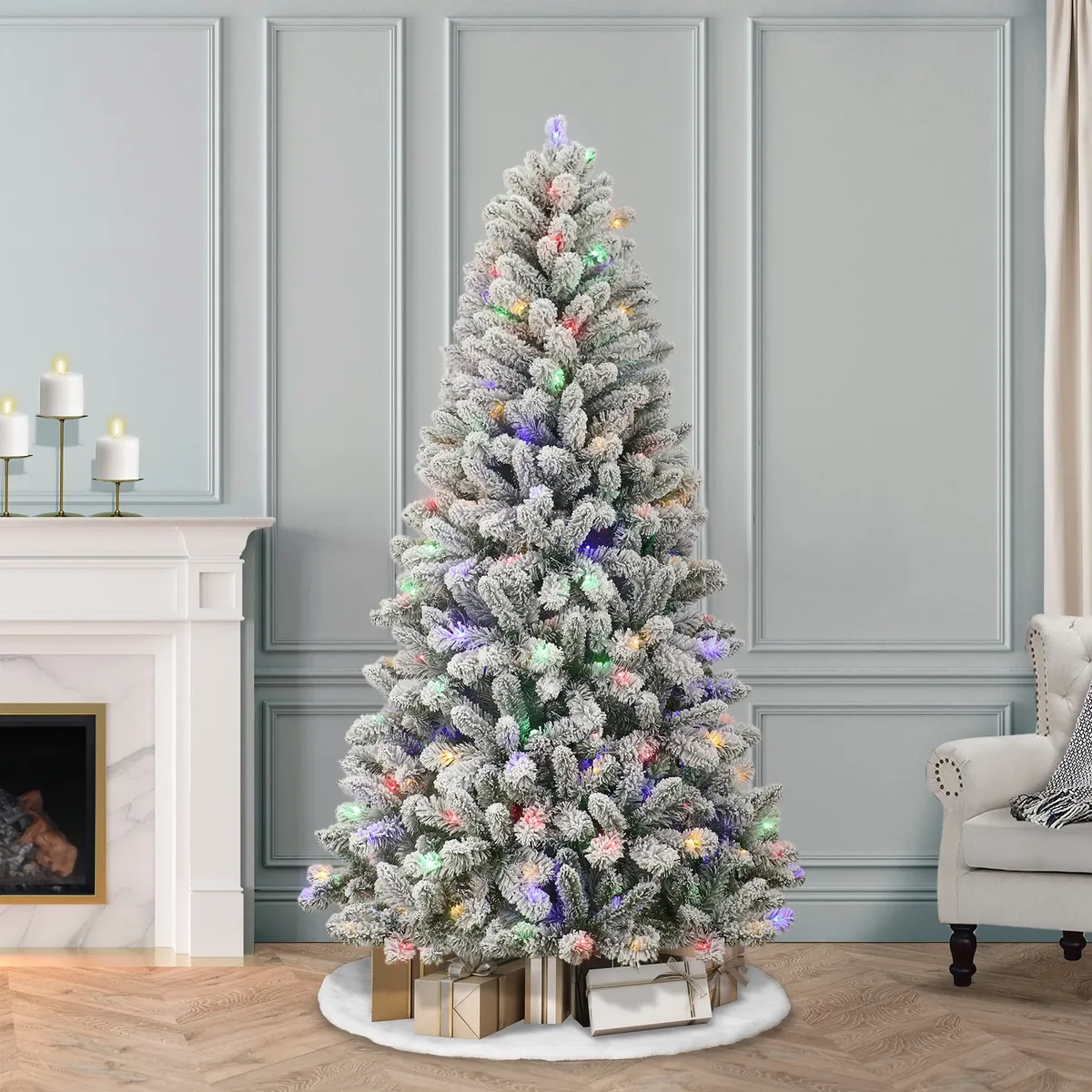 Venmo6.5' Pre-Lit Green Flocked Frisco Pine Artificial Christmas Tree with 250 Color-changing LED Lights, by Holiday Tim Capture the charm of a snow-dusted forest with the Holiday Time 6.5-Foot Pre-Lit Flocked Frisco Pine Christmas Tree. This beautifully flocked tree features 821 branch tips for a full, natural appearance and comes pre-lit with 250 color-changing LED lights that offer nine different lighting functions to match your holiday style. Standing 6.5 feet tall with a 42-inch diameter, it's a great fit for medium to large rooms, whether fully decorated or left to shine on its own. The flocked branches and realistic pine needle texture bring wintry elegance indoors, while a sturdy metal stand keeps everything securely in place. Designed for easy setup and long-lasting use, the Holiday Time 6.5-Foot Pre-Lit Flocked Frisco Pine Christmas Tree includes a reinforced top branch to support your favorite tree topper. Holiday Time 6.5' Frisco Pine Pre-Lit Green Flocked Artificial Christmas Tree with 250 Color-Changing LED Lights Features 821 flocked branch tips for a full, snow-covered look Pre-lit with 250 color-changing LED lights offering 9 lighting functions Measures 6.5 feet tall and 42" in diameter, ideal for medium to large spaces Sturdy top branch holds a star, angel, or other tree topper securely Realistic needle design creates the look of a freshly flocked pine Includes a durable metal tree stand for added stability Simple assembly with included instructions Designed for indoor use only Built to be enjoyed season after season 192529 1-16-26 00.3 rt64
