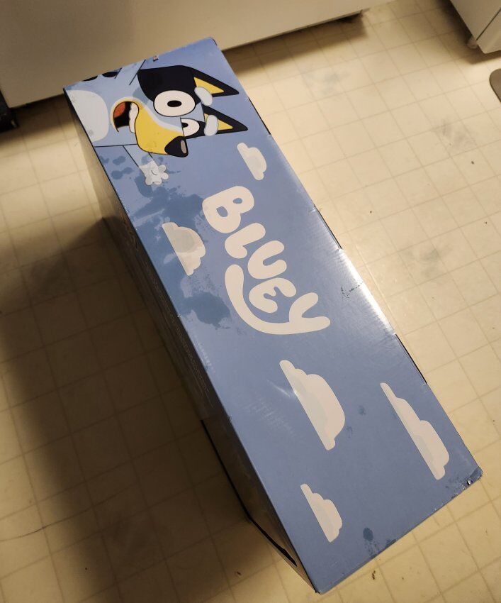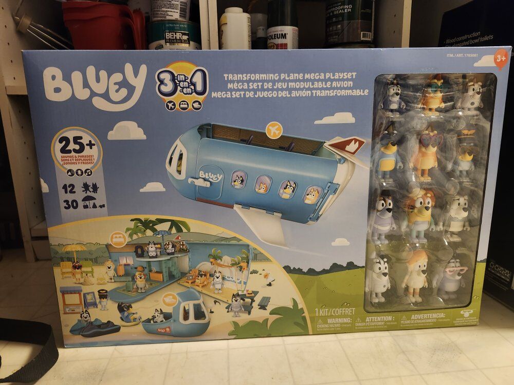 VenmoThis is a brand new, never opened Bluey 3‑in‑1 Transforming Plane Mega Playset. Perfect for hours of imaginative play! The toy inside is completely untouched and ready to go. The box has new grease stains from a simple storage mishap (put an unopened bag of popcorn on it) but I’ve included photos showing the box before the stain so you can see it was originally pristine. The playset itself is perfect for play and a great value for a popular Bluey set.