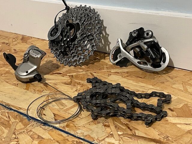 PayPalShimano 9 speed groupset removed from a mountain bike. Shimano LX trigger shifter, shimano XT rear derailleur, shimano CS-M750 cassette, 12-34 range, and chain included. Good cleaning needed. $50 for everything picked up in SLC.