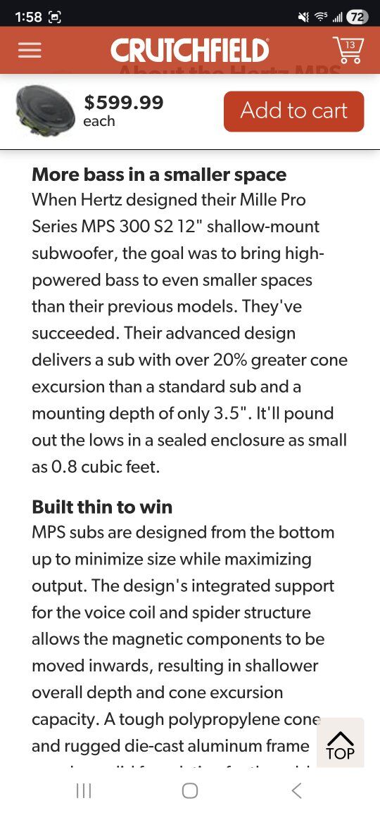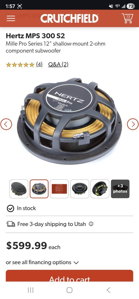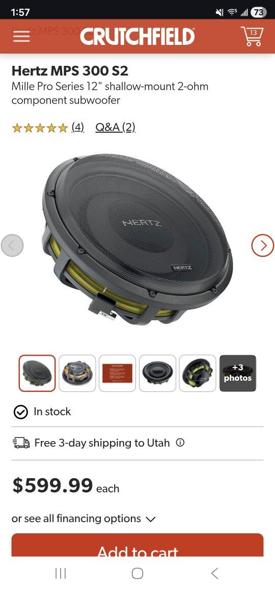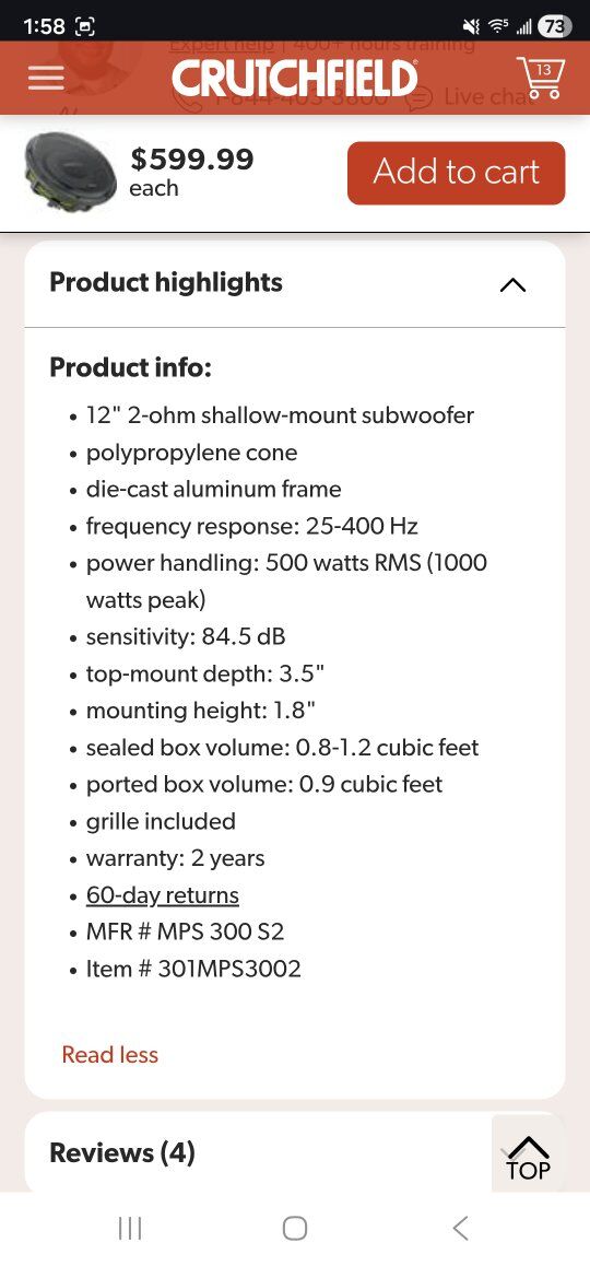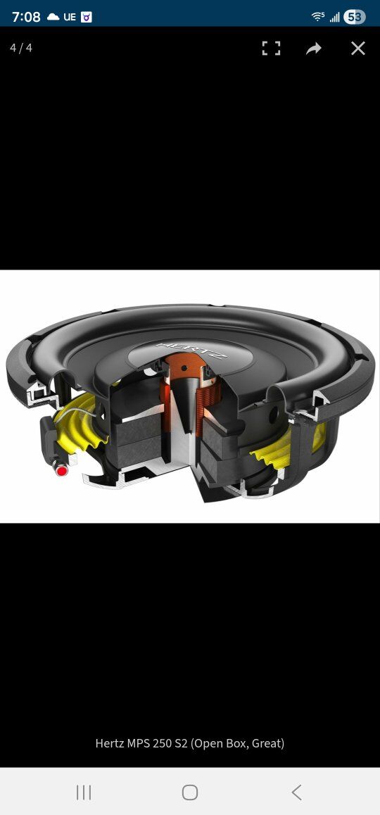 ZelleThis sub is like new and really does live up to everything ive researched. im hoping find one thats 2 Ohm as this one is 4 Ohm. My 5 channel Audison is under powered for the Ohm rating is all. im including a new sealed box to go with. I can add more for your trouble as well. Also I would consider another Shallow 12" sub like a JL or focal. Thanks for your time and please text or call with any questions!