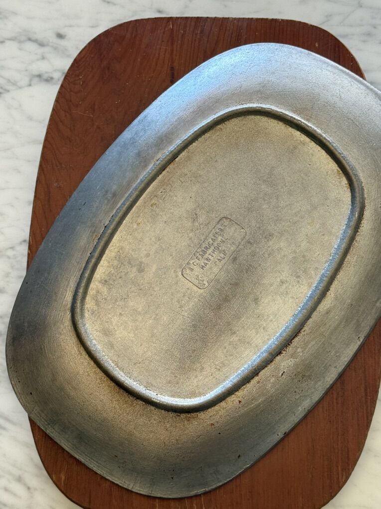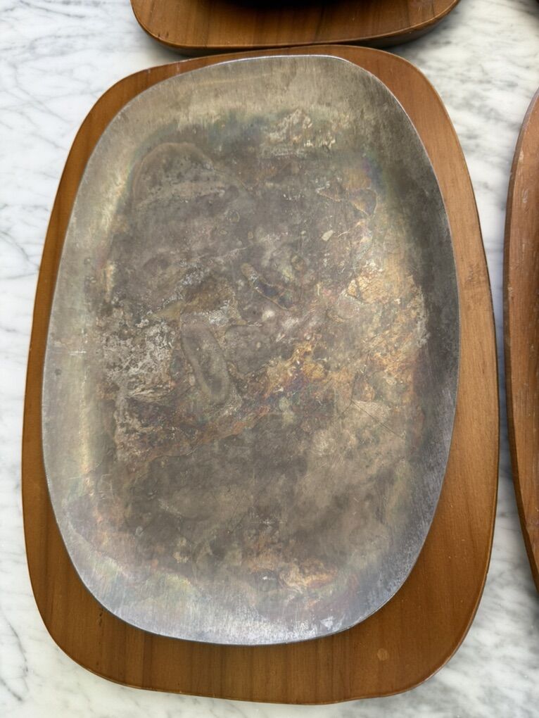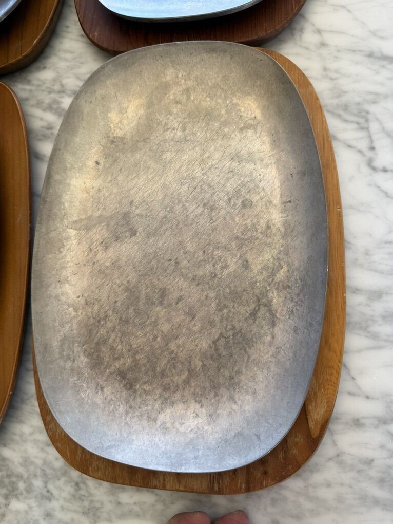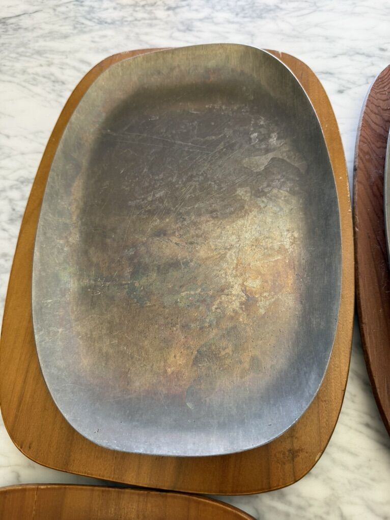 ApplePayThese are vintage mid-century modern cast aluminum sizzler platters with wooden bases. They are designed for serving sizzling hot dishes like steaks or fajitas.