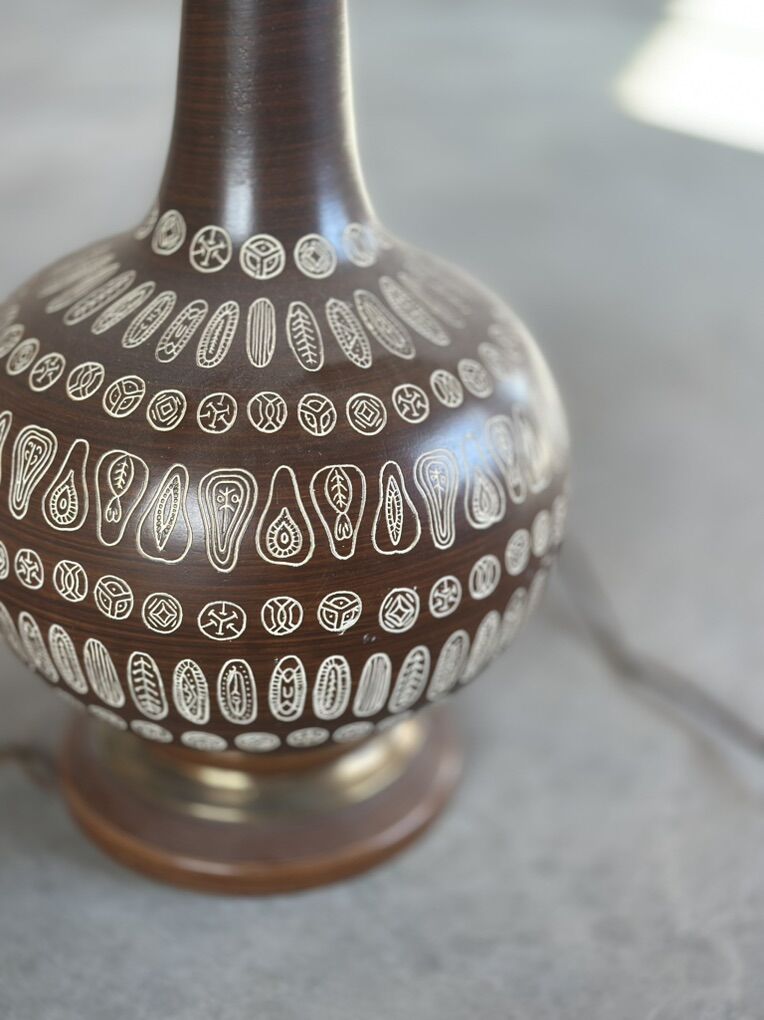 CONDITION: Excellent vintage condition. The ceramic body is free of chips or cracks. The hand-etched white sgraffito patterns are vibrant against the dark textured base. Original 1960s wiring is fully functional.