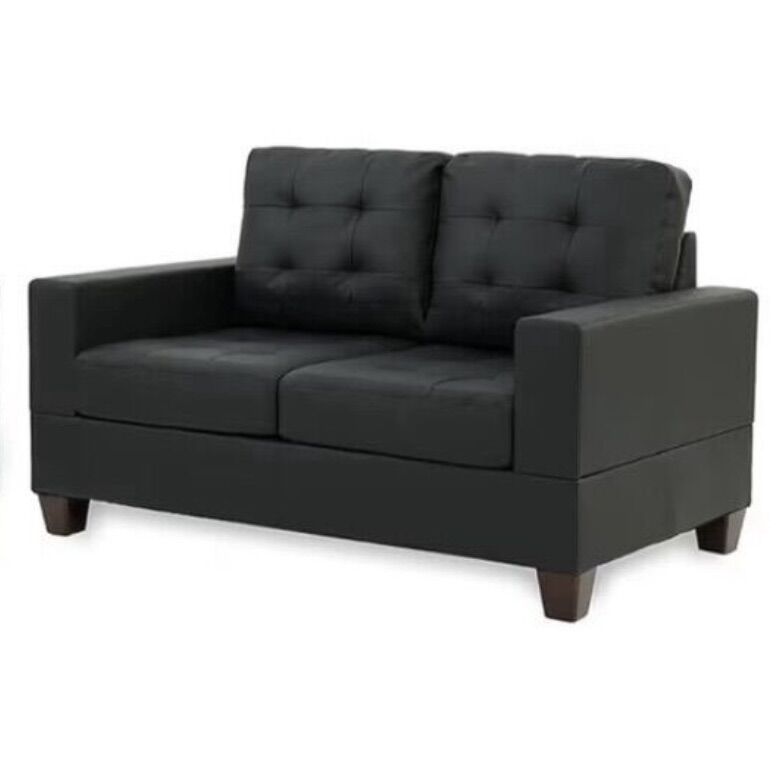 Brand new sofa and love seat (faux leather) Perfect for small place nothing wrong; easy to transport and easy to move; Color: black Can deliver for extra Loveseat 56 × 35 × 37 H 2-seat sofa 72 × 35 × 37 H