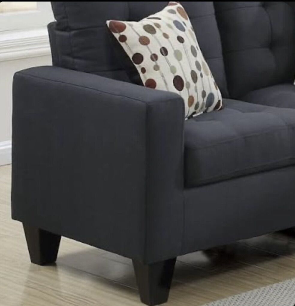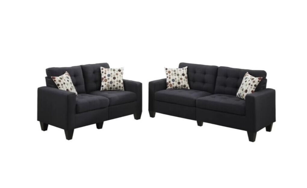 Description New small sofa and love seat easy to move and easy to transport perfect for small place, apartment, basement etc, Each piece is upholstered in a linen-like cushioned fabric with asymmetric tufting and light accent stitching. (Polyfiber Linen-Like Fabric). Dimensions: Loveseat: 58 × 32 × 35H; Sofa: 72 × 32 × 35H Material: Color: Black