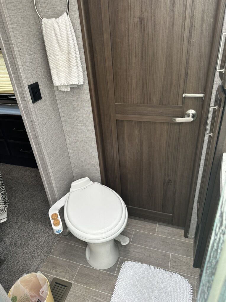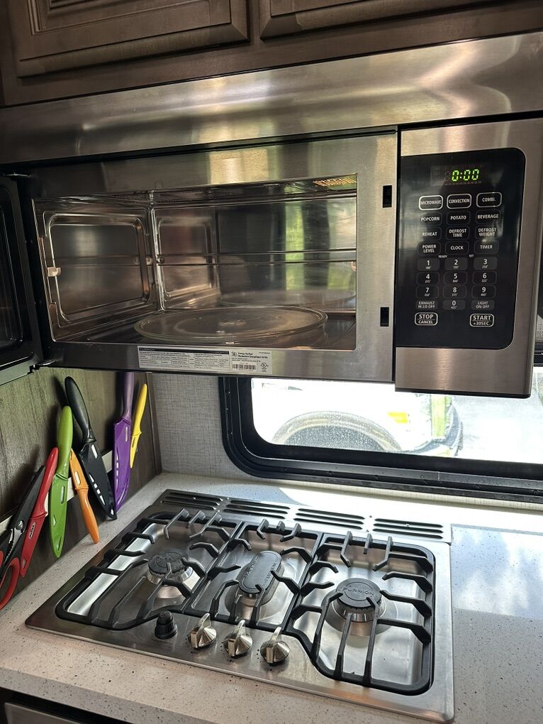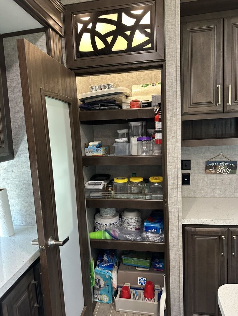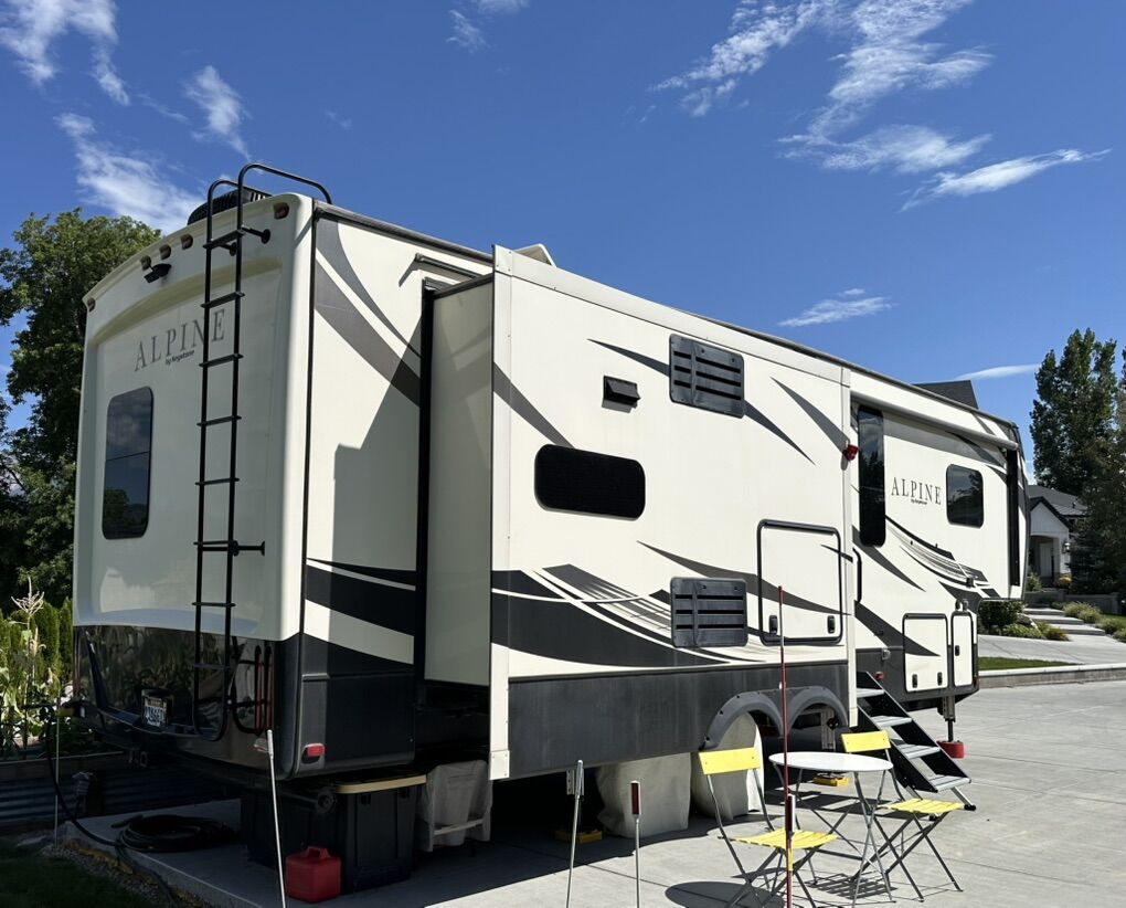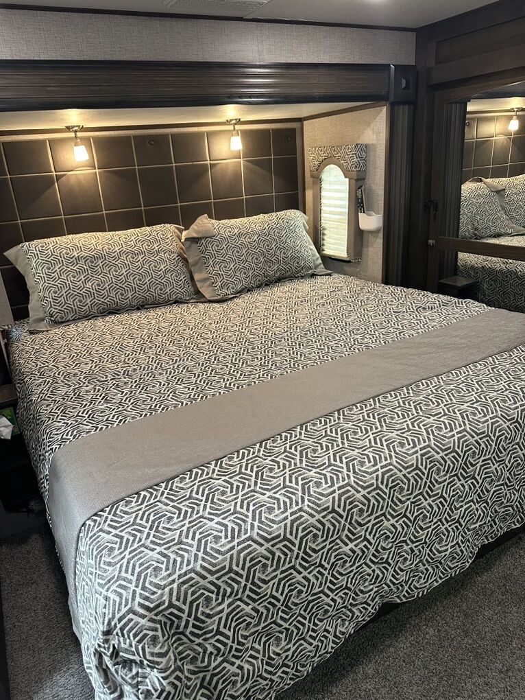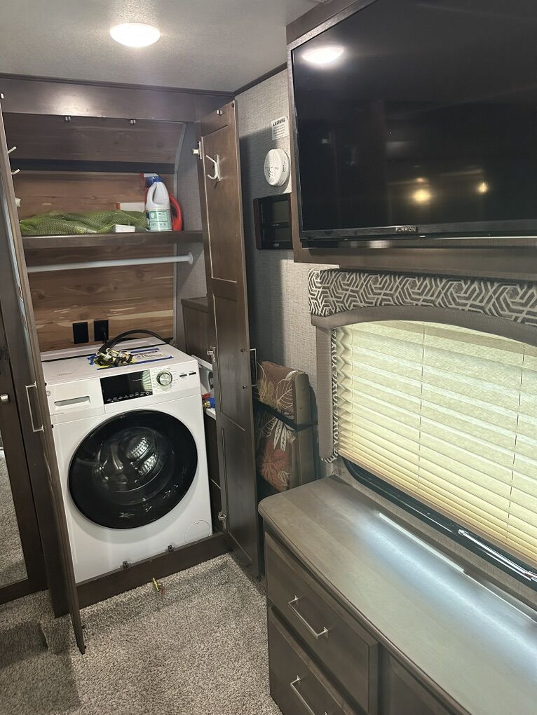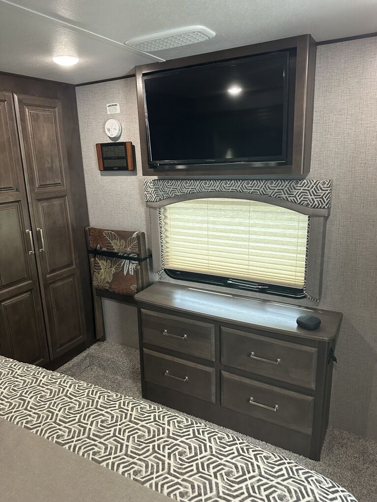 Venmo3 slide outs, polar pack, 34.5’, 18 Cu side by side refer, twin A/C, solar panels, washer/dryer combo, king size memory foam master, three Flat screen TVs, large pantry, central vacuum, bidet toilet seat, power awning with accent lighting, 6 point auto hydronic leavening, G-range tires, large storage compartments, rear back up camera, solid step, porcelain toilet, skyline shower, electric fireplace, frameless windows, large main clothing closet with mirror,