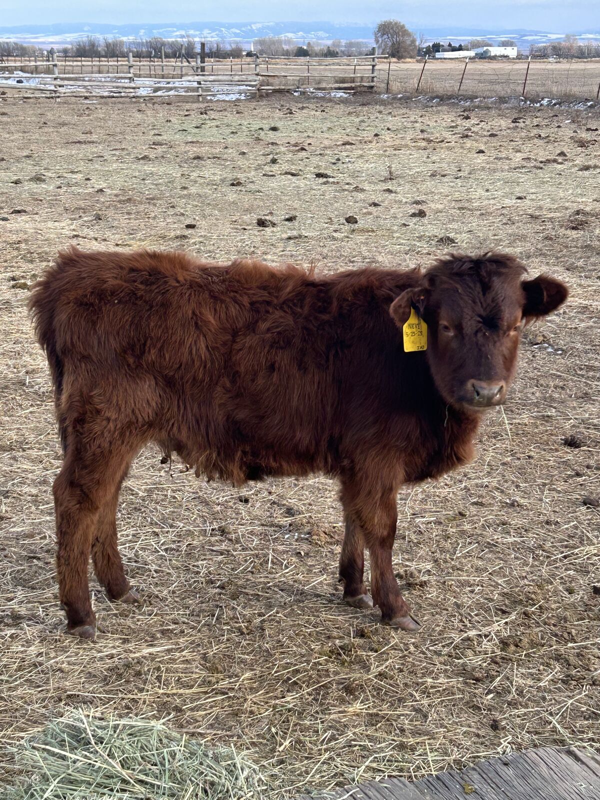 Description: Red dehorned heifer will be a year old at the end of May. She is not halter broke but is young enough to be if someone has time to work with her. Her sire carries dun so she has the possibility of caring dun as well. Her dam was one of my largest producers of milk and her granddam on her sire’s side was as well. She has the possibility of producing a lot of milk if you are looking for a cow to milk.
