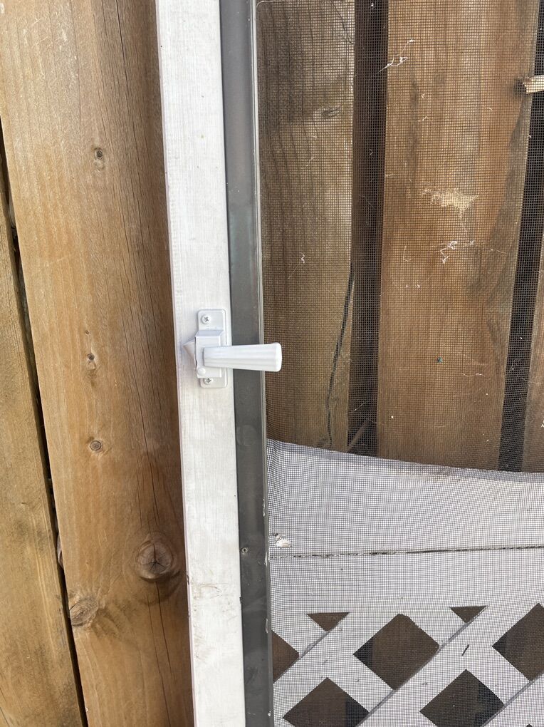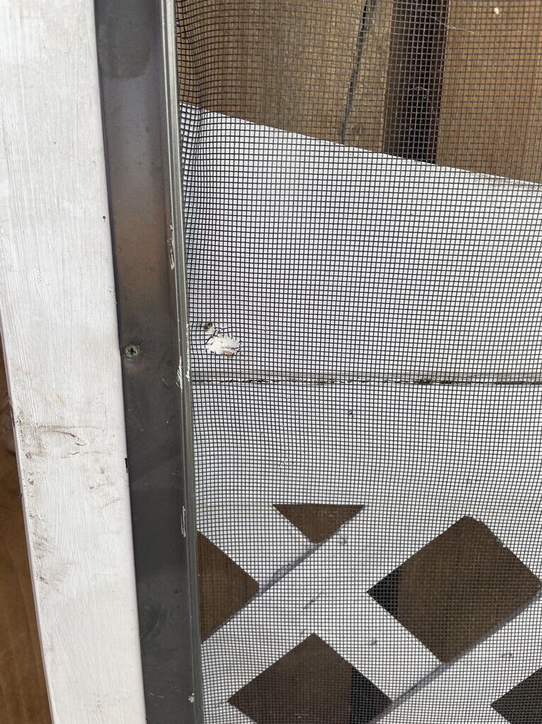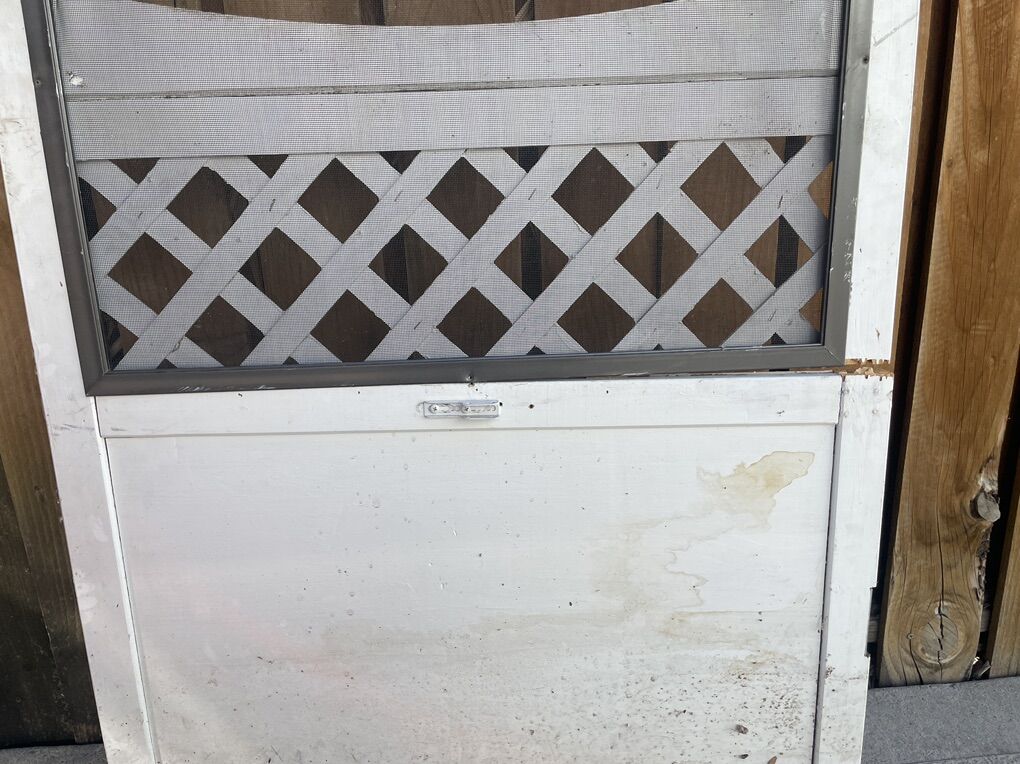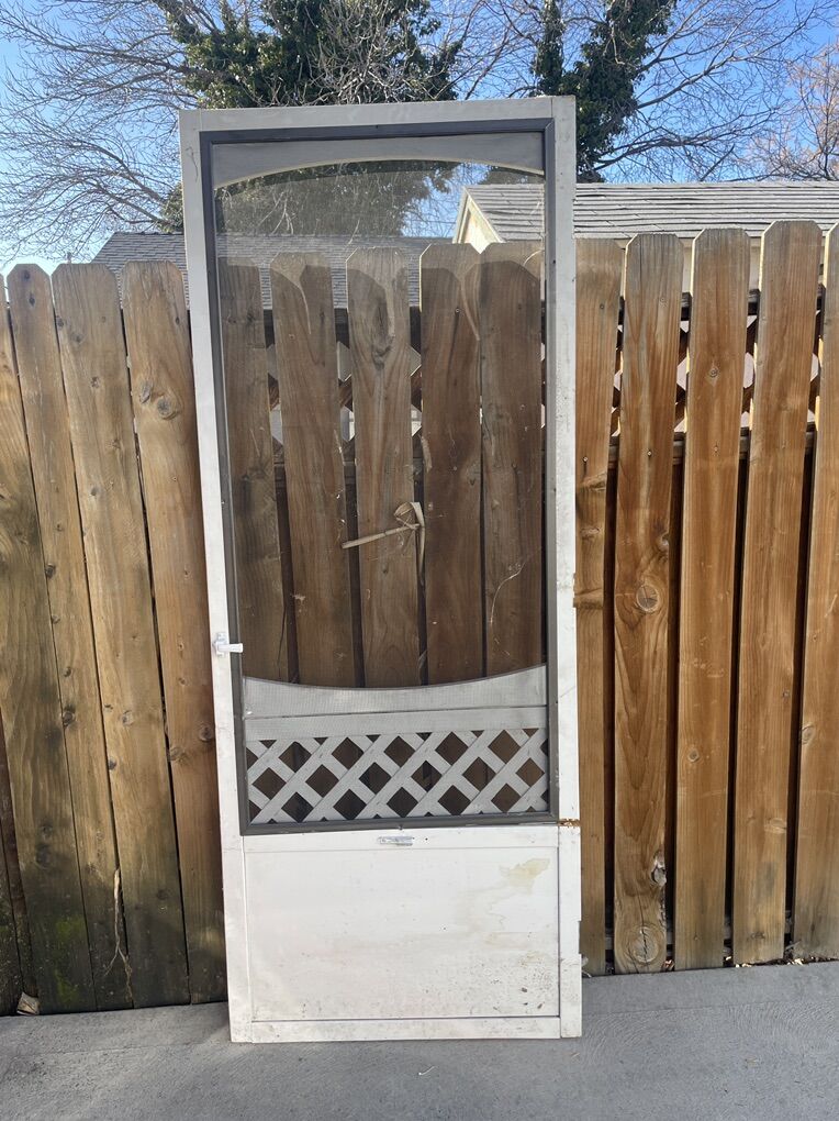 Free screen door for repair or parts. Has a crack in the wood on one side, a small hole in the screen, and the handle button cover is missing. Measures 32 x 81. Pick up only. Located in Sugarhouse near Dancing Cranes.
