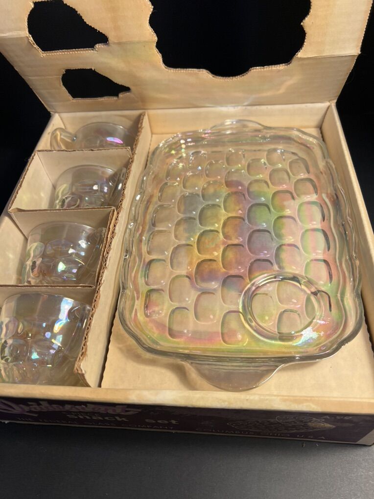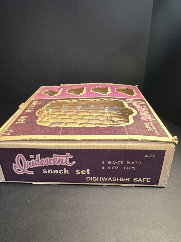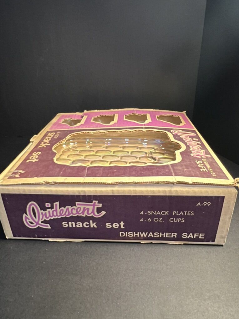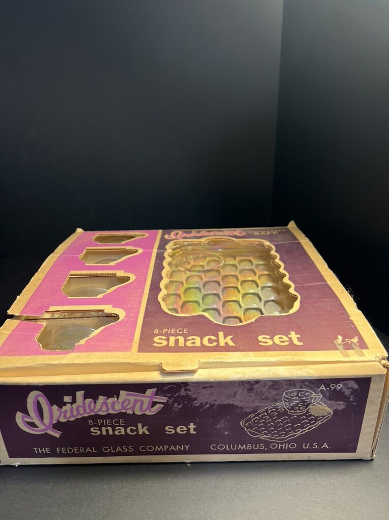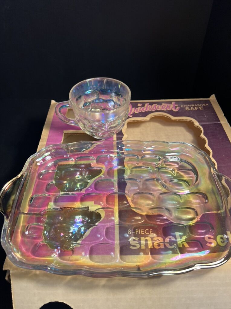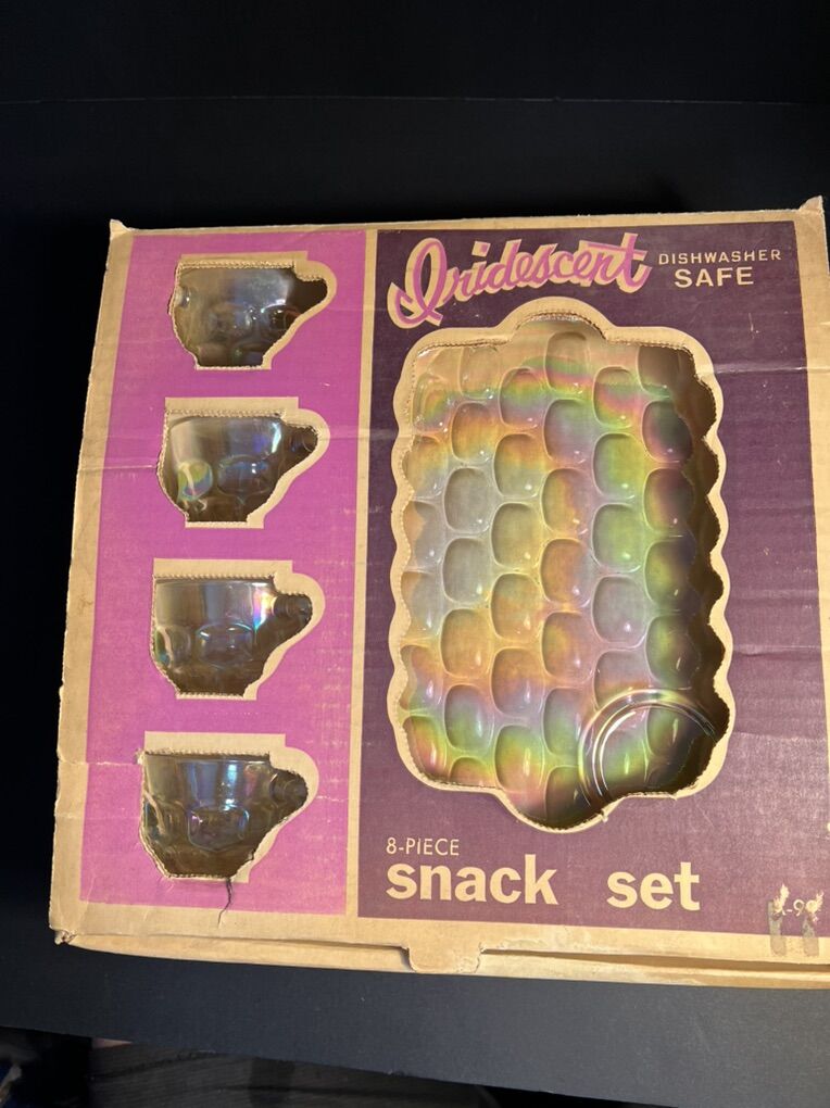 VenmoVintage Federal Glass Iridescent 8-piece snack set. The set includes four plates and four 6-ounce cups, designed for serving snacks or desserts. It features an iridescent, rainbow-colored finish and a textured pattern that resembles scales. These snack sets were popular in the 1950s and 1960s for luncheons and bridge parties. The set is dishwasher safe. It comes in its original box and is a collectible item.