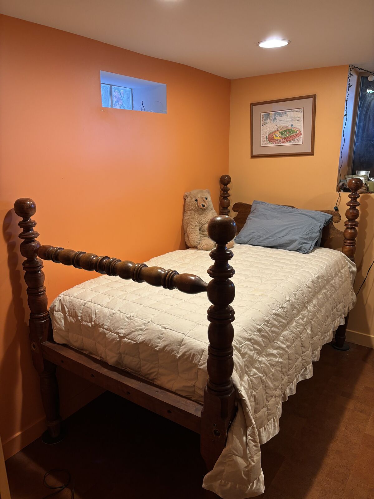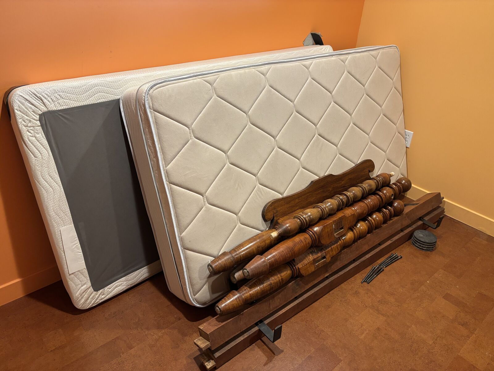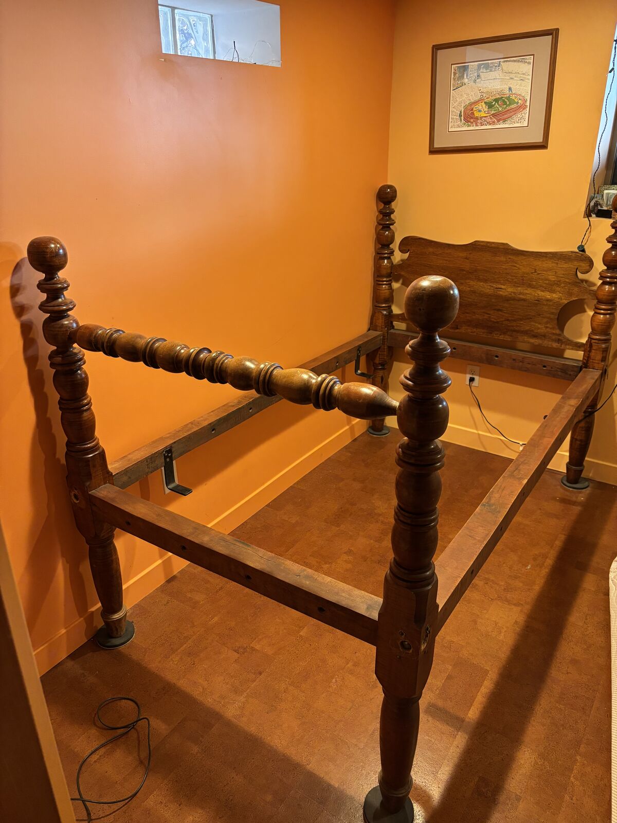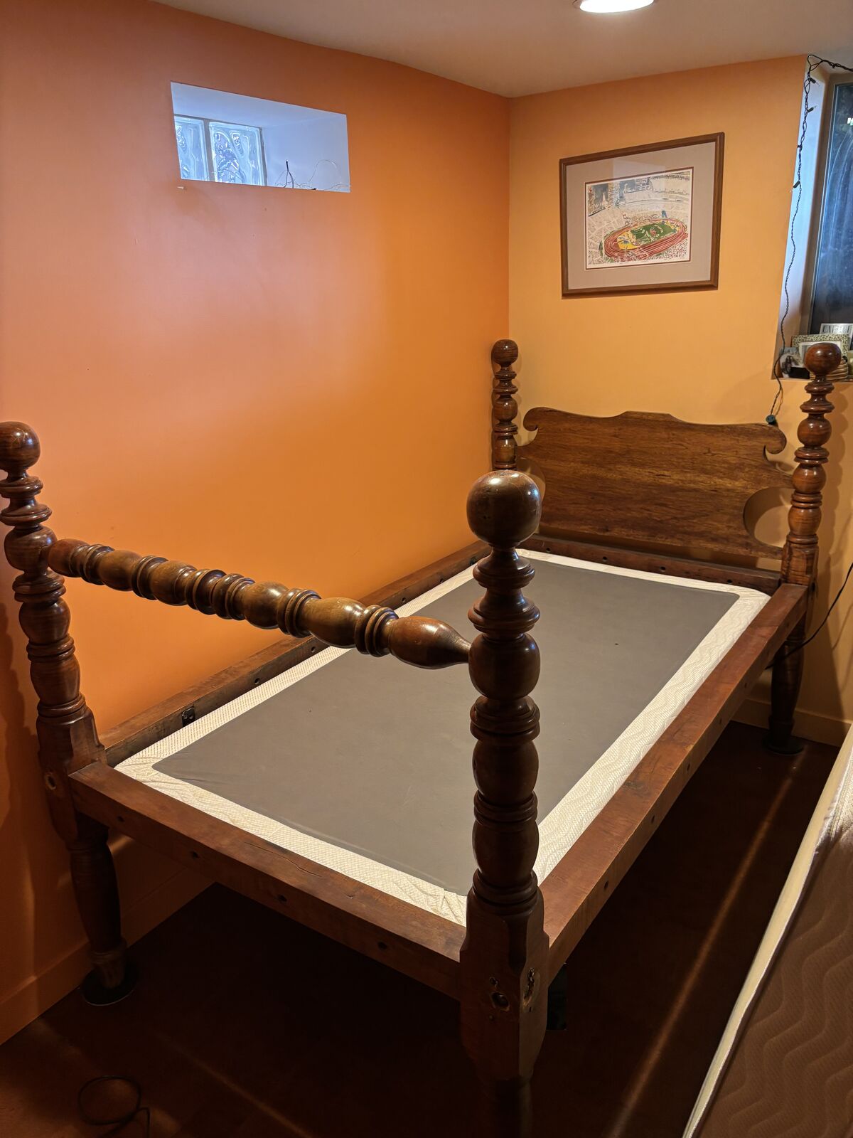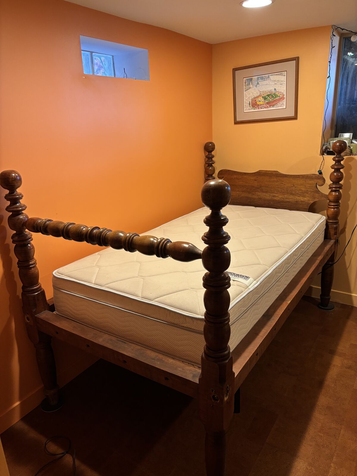 VenmoThis is my childhood bed!! Gorgeous Tiger maple bed with custom size mattress. It is technically a rope bed but instead of ropes it has heavy duty brackets to hold the matress in place.