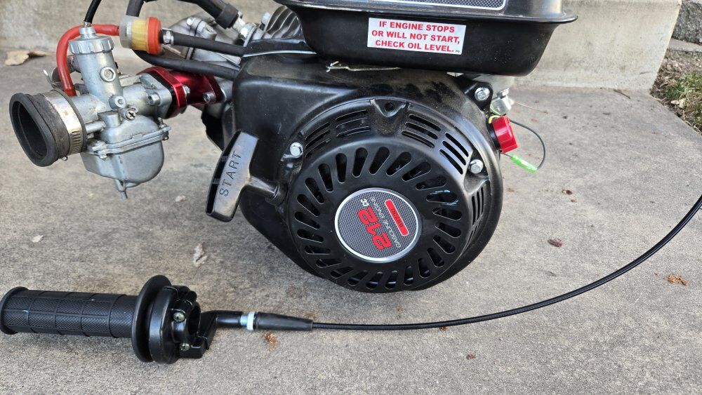 VenmoPredator 212 w/ Aftermarket Carb Kit. Starts right up. Comes with the twist throttle. I did not add the kit, it came off a mini bike that I bought so I don't know if any engine work was done to it. I do have the exhaust for it but will need a filter.