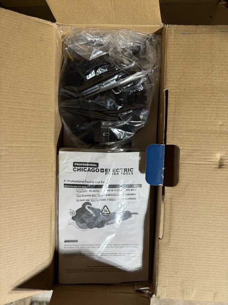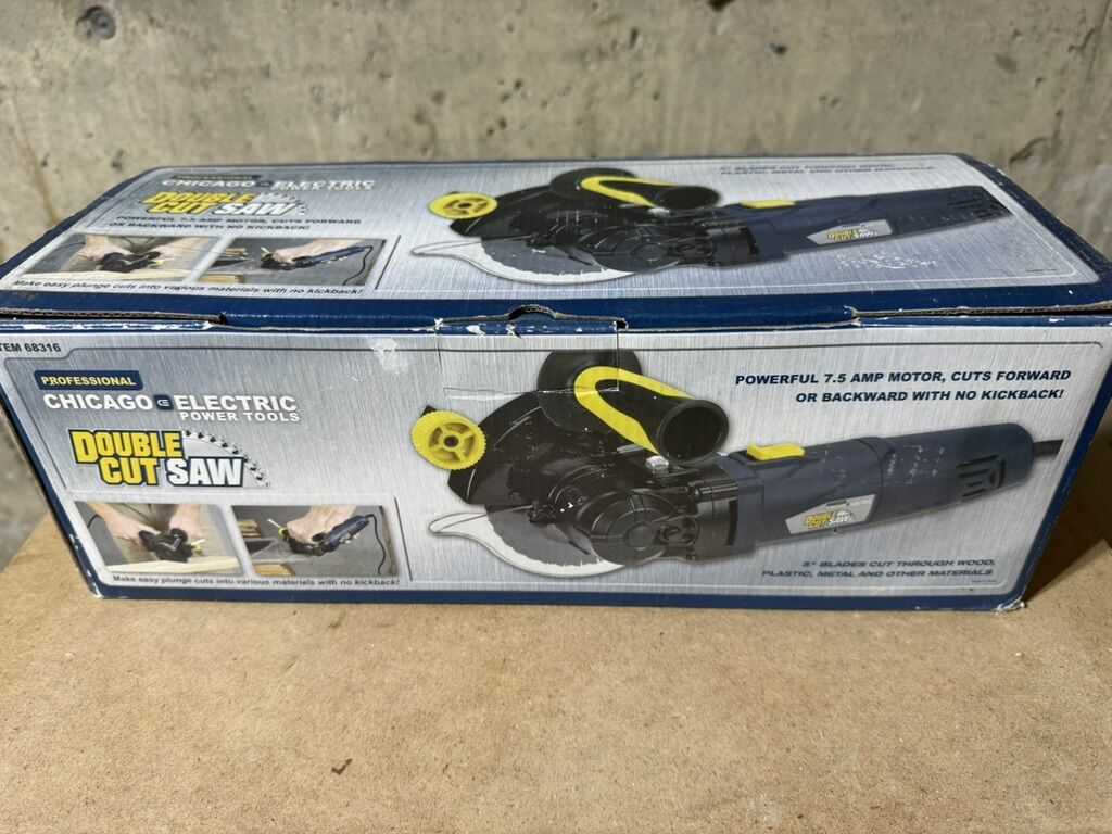 VenmoChicago Electric Double Cut Saw in excellent condition. Comes in original box with manual and accessories. Tool appears lightly used or barely used.