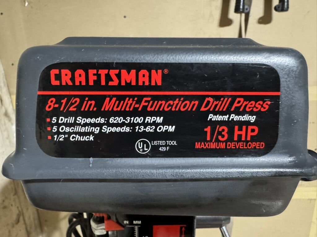 VenmoCraftsman 8-1/2” multi-function bench-top drill press in good working condition. Model 149.21331. Features a 1/3 HP motor, 5 drill speeds, and a 1/2” chuck. Runs smoothly and drills accurately.