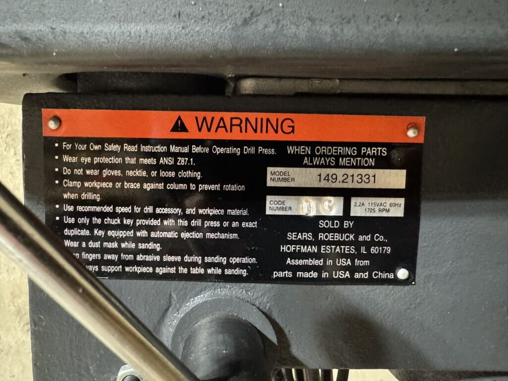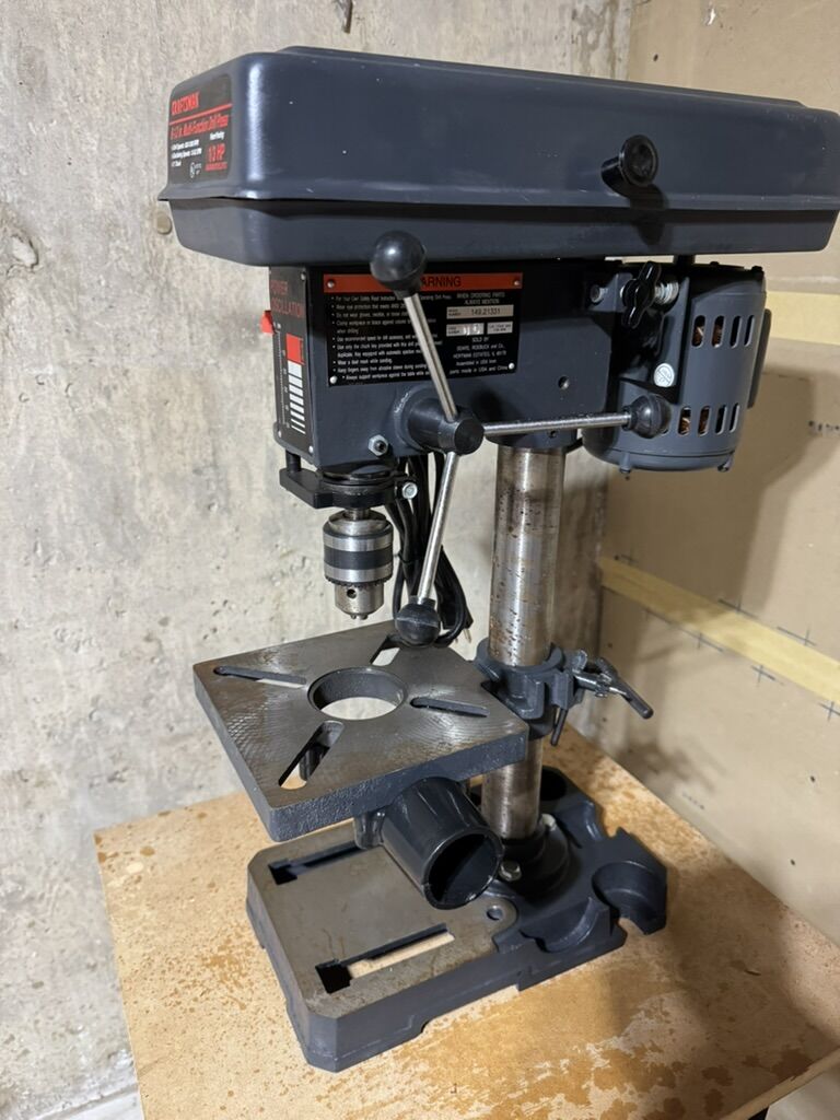 Includes adjustable table and standard chuck. Shows normal cosmetic wear from use but no functional issues. Great for woodworking, metal drilling, shop projects, or a home garage setup.