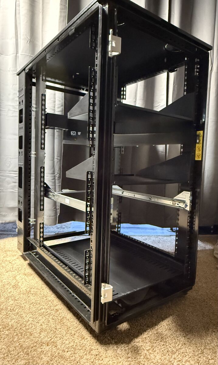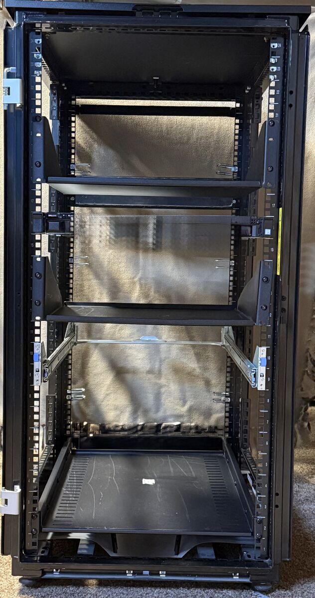 ZelleServer rack with 24 slots and 2 shelves. Dimensions: 23.5 inches wide, 39.5 inches deep, and 47 inches tall. Server Monitor Rack available on another listing.