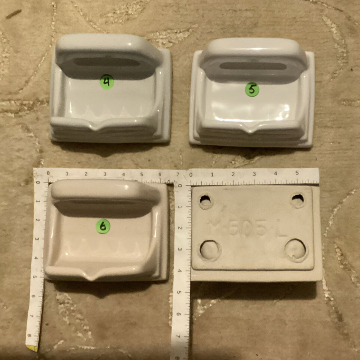 I have 90 brand new vintage soap dishes of various designs and 8 corner shelves for sale. They are in perfect condition with no defects and made very well. These soap dishes have been discontinued and are perfect to use if replacing a soap dish in an older tub/shower due to their size. I have found only one supplier on the internet who has the shell design and they are priced at $59 each. I have included some photos from their website for your convenience. On the low end, these would cost $5,880 plus tax and shipping,…well over $6500. I’m asking $ 900 for the entire lot, or will sell individual pieces for $15 each. The first photo shows the items I have available and are numbered to coincide with the descriptions below, to include color, quantity available, online price, my price, and dimensions of the dish itself and the insert on the back. All measurements are width x height in inches.
